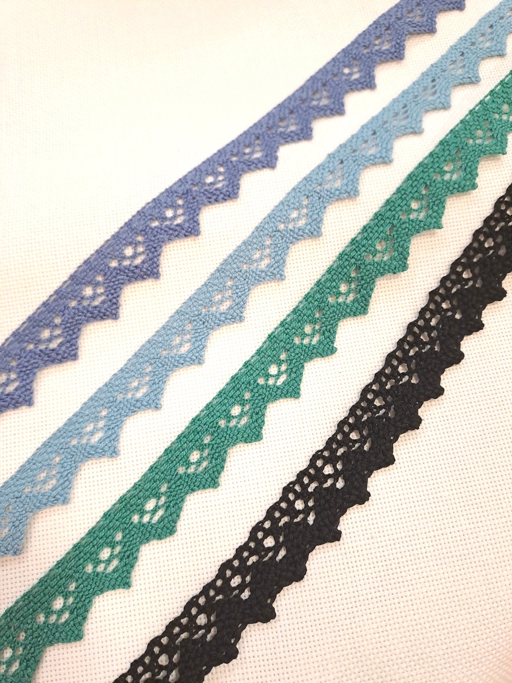 Este o dantelă rustică din bumbac cu model în zig-zag și o lățime de 2,5 cm.