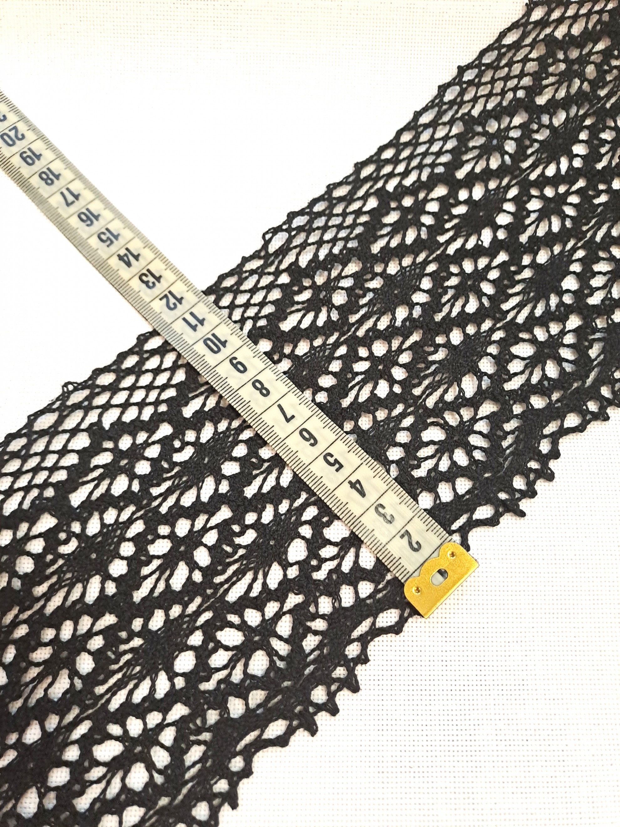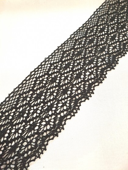 Este o dantelă rustică neagră din bumbac cu model în romburi. Pe o parte are colțișori.