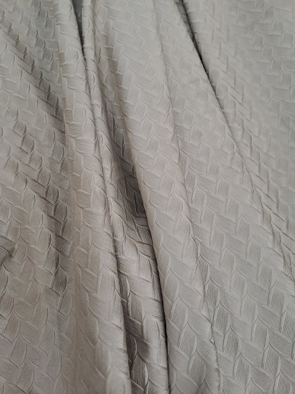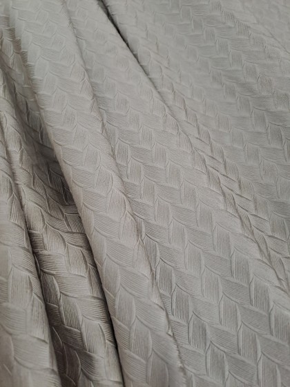 Este o draperie din catifea bej amprentată cu model împletit ușor în relief.