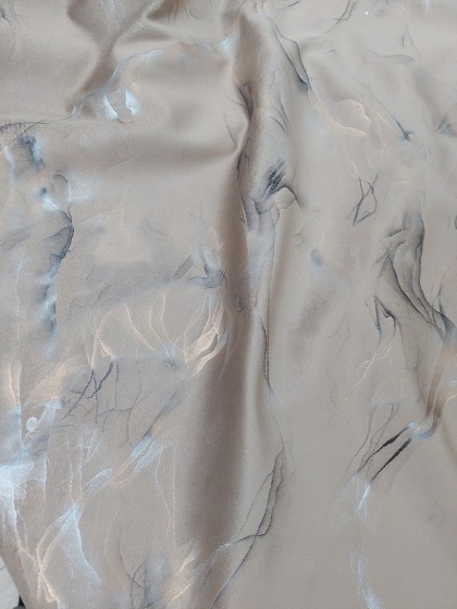 Este o draperie din catifea bej cu model "fumuriu" discret negru cu auriu și argintiu.