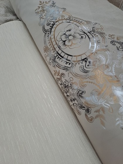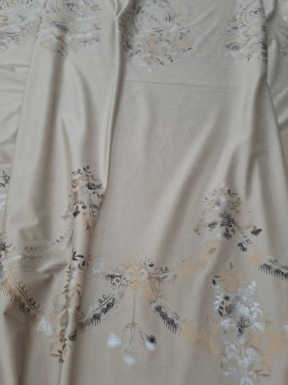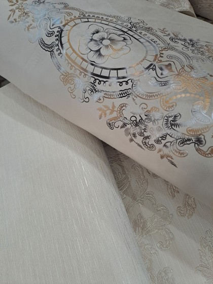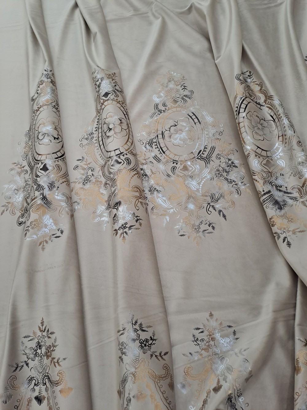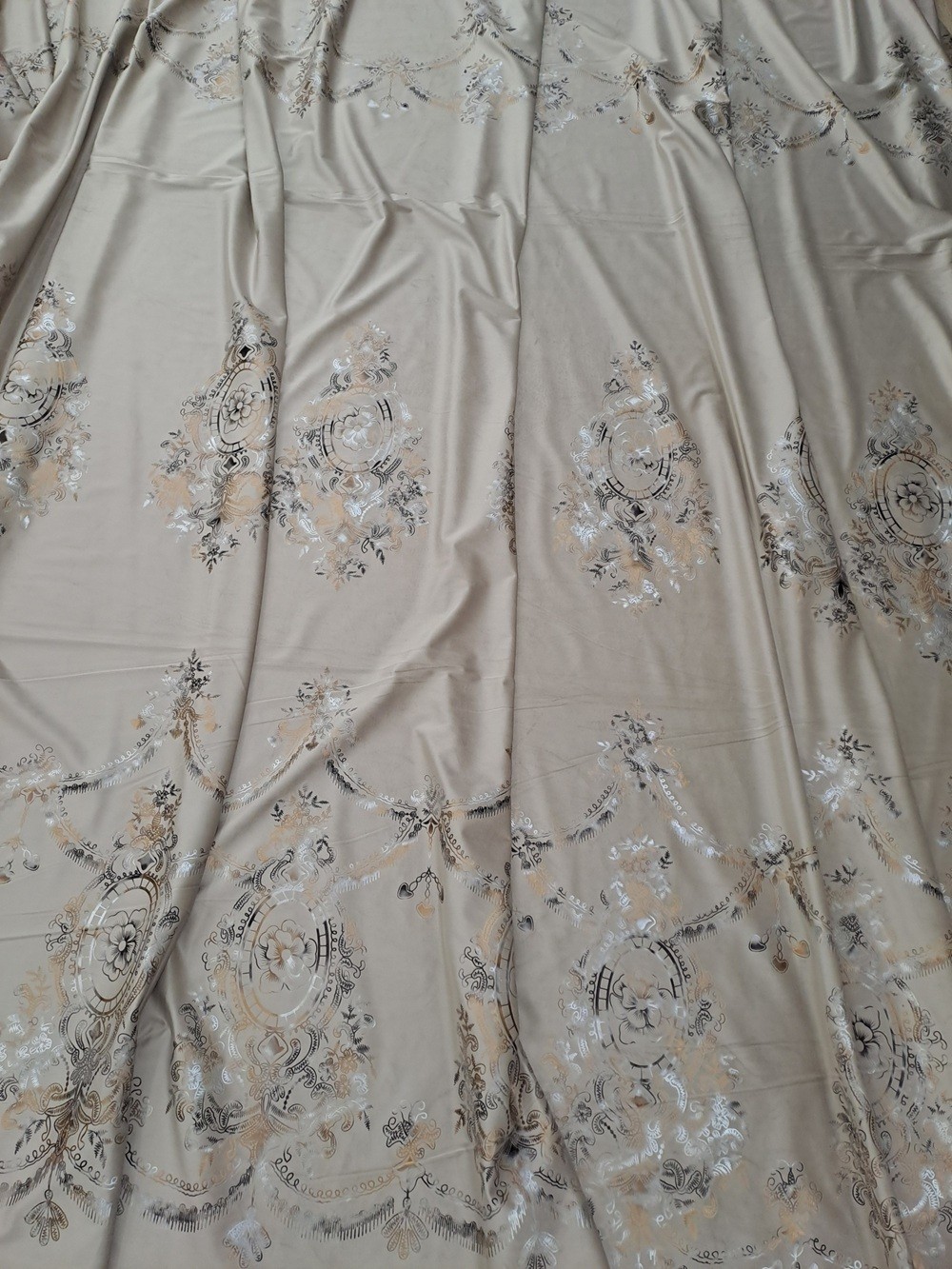 Este o draperie bej deschis imprimată cu borduri din medalioane clasice negru, auriu, argintiu.