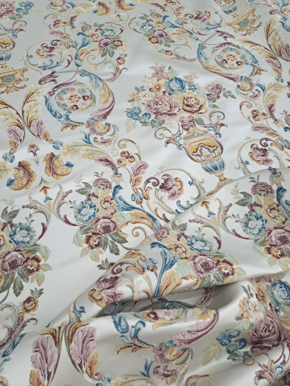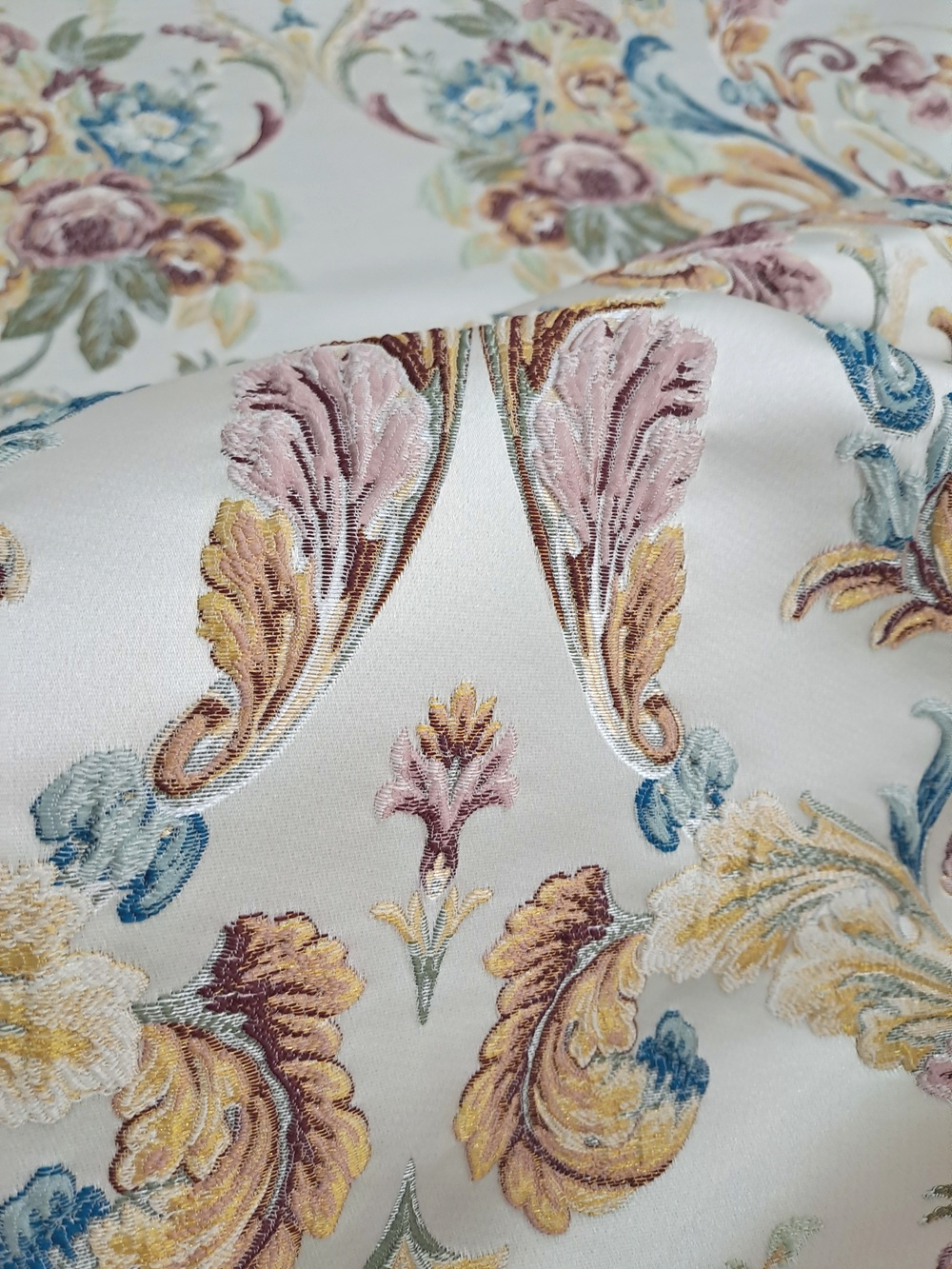 Este o draperie crem cu ghirlande clasice maro, bej auriu, roz, turcoaz ieșite ușor în relief.