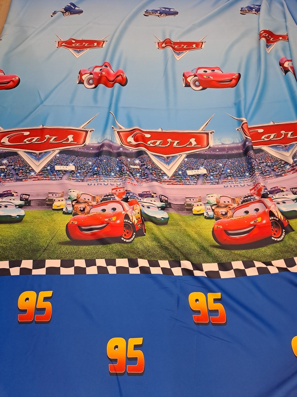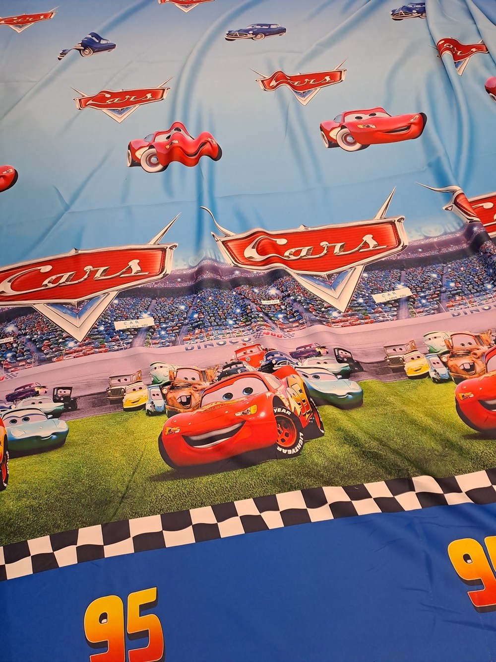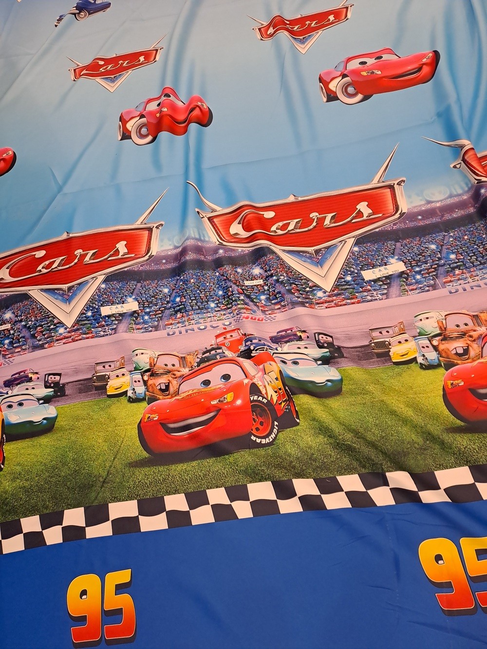 Este o draperie imprimată cu mașinuțele de raliu din desenele animat CARS.