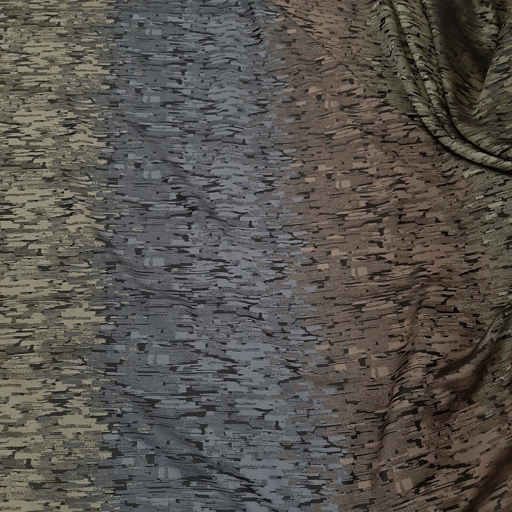 Este o draperie cu model texturat în coloane verticale pe înălțime: gri, bej,maro închis, mov, plămâniu.