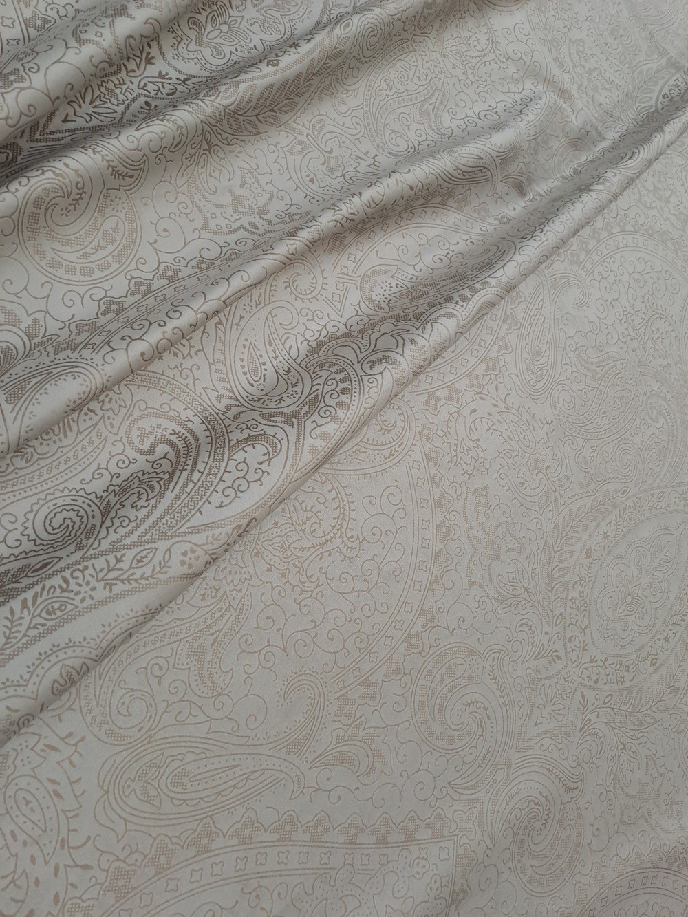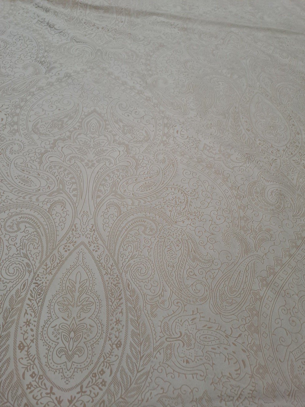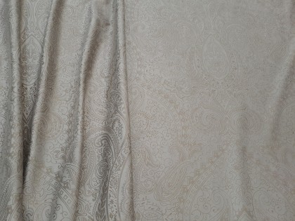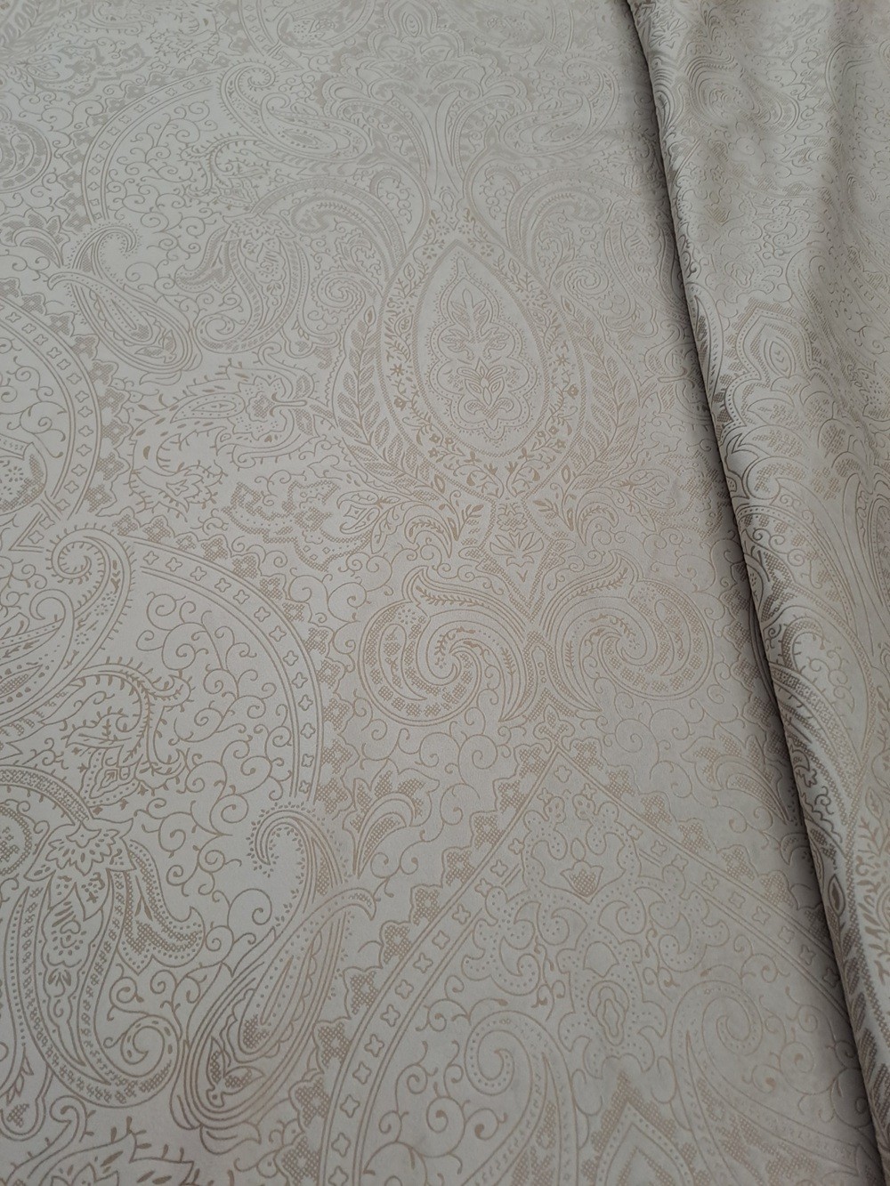 Este o draperie din catifea bej deschis imprimată cu model oriental dantelat.