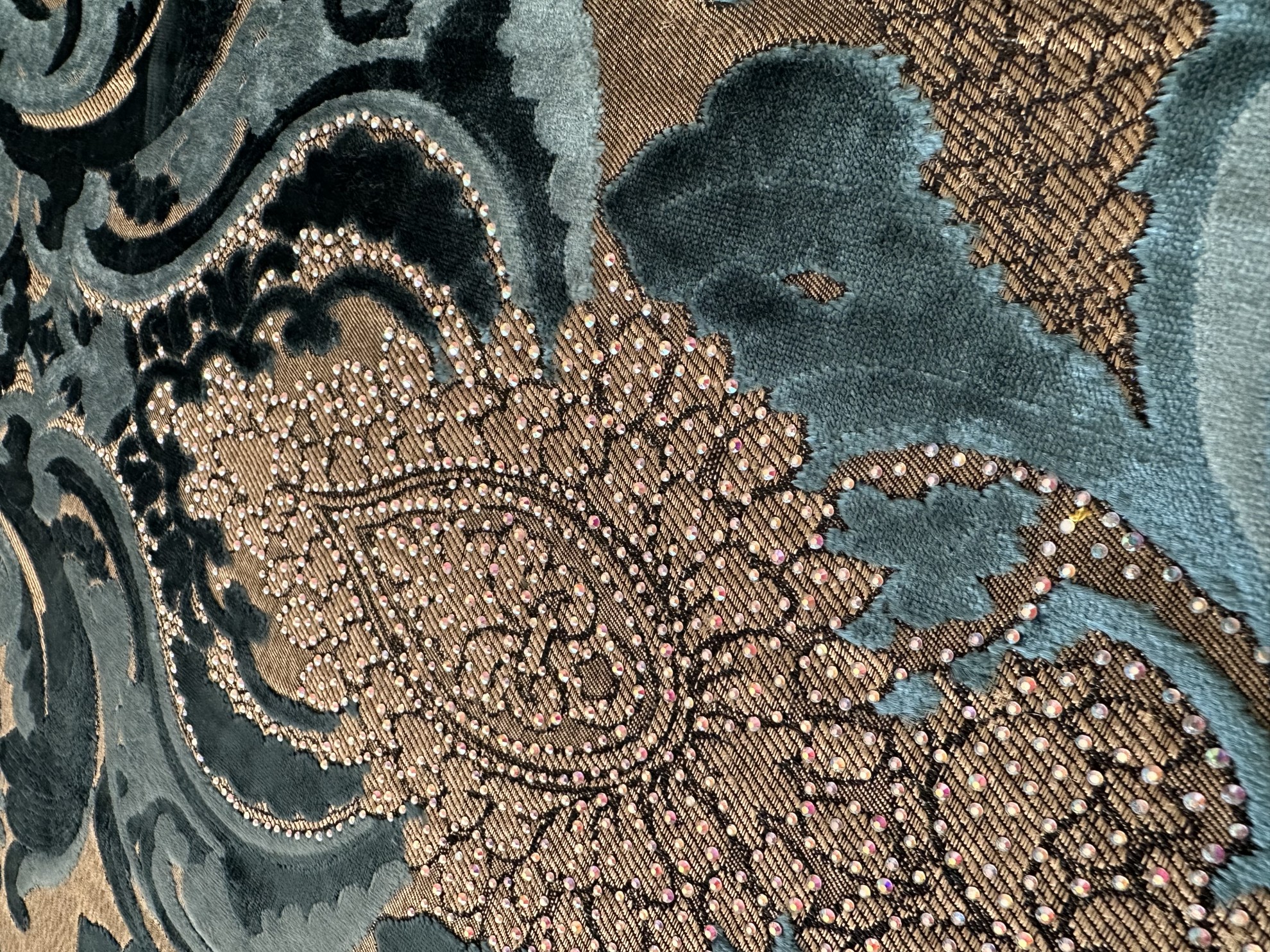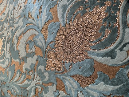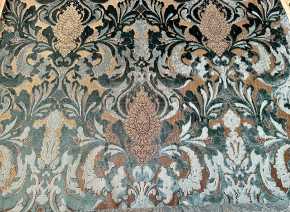 Este o țesătură deosebit de elegantă cu model 3 D din catifea cu model stilizat baroc amprentat cu mătase argintie. Pe alocuri are inserții de cristale ce conturează frumos medalionul .