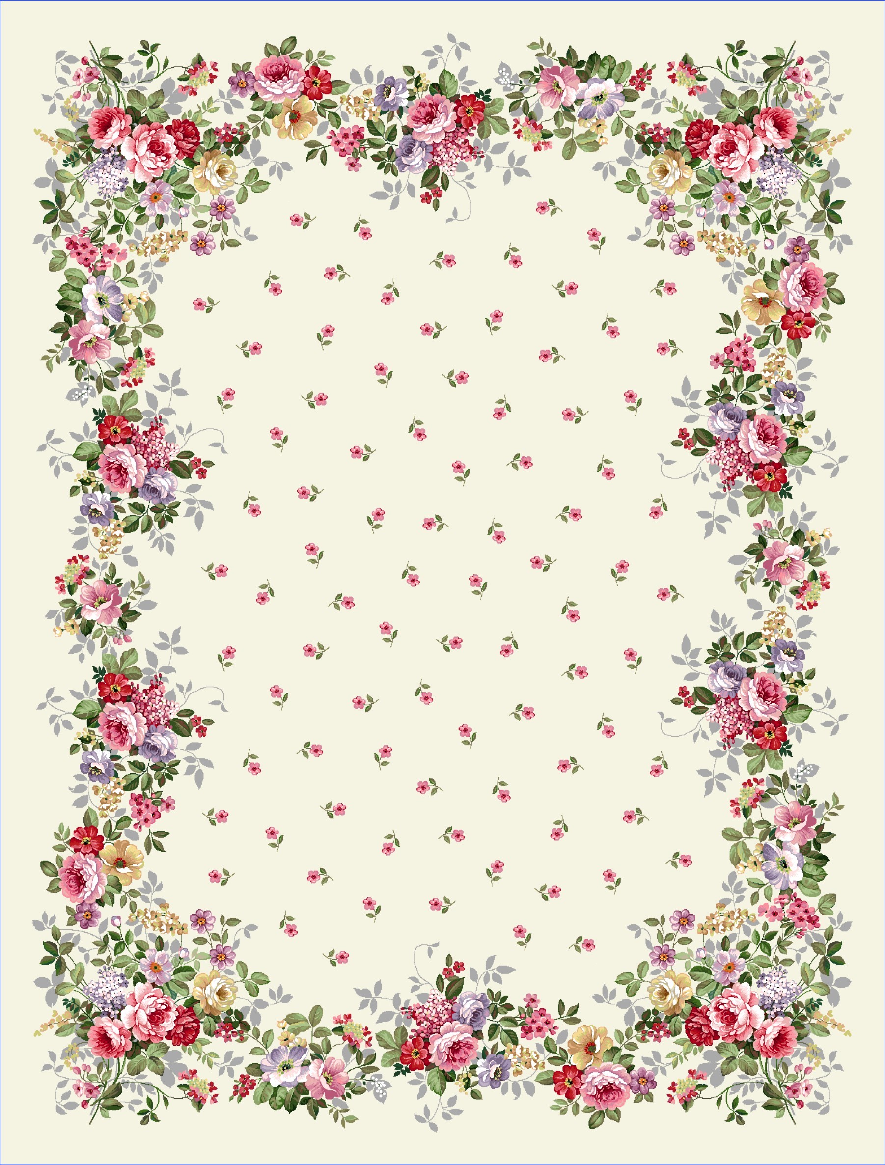 Față de masă goblen crem cu trandafiri roz și crem. pe margini are o bordură generoasă cu trandafiri, iar pe mijloc modelul floral este mărunt.