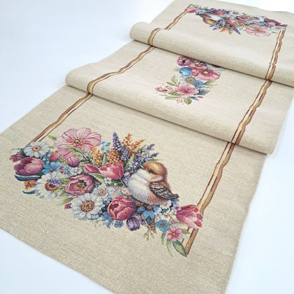 Este o față de masă din țesătură tip goblen cu porumbei albi, ramuri de măslin și ouă. Decorul este încadrat într-un chenar gri.
