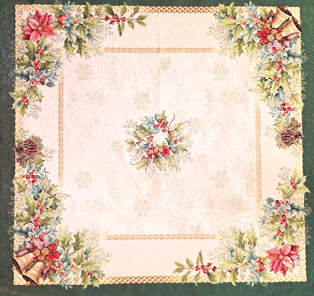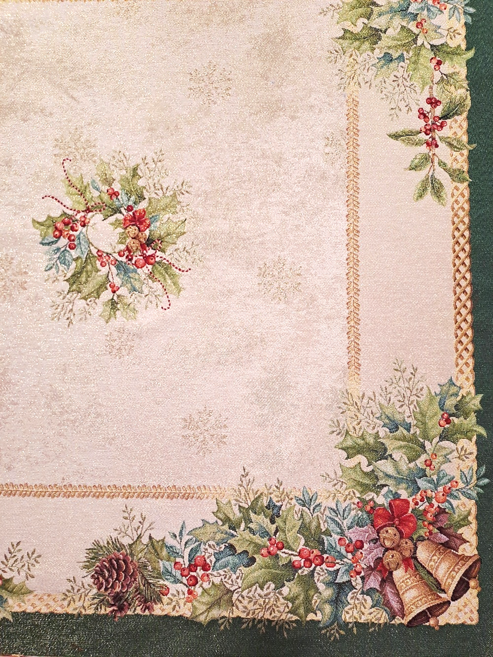 Este o față de masă din țesătură tip goblen crem cu Crăciunițe și clopoței în chenar verde.