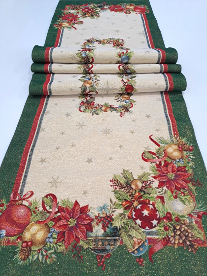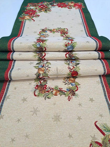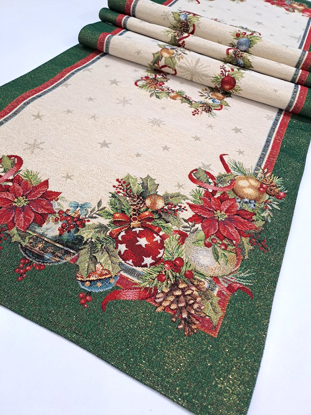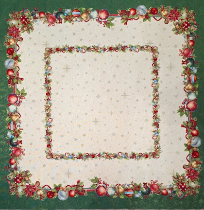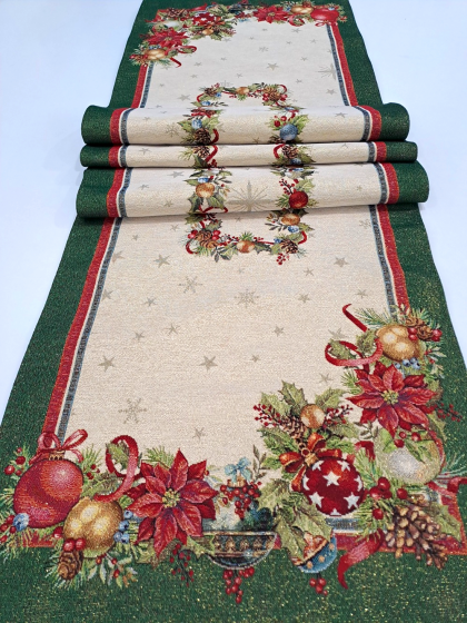 Este o față de masă din țesătură tip goblen crem cu ghirlande de globuri încadrate în chenar verde.