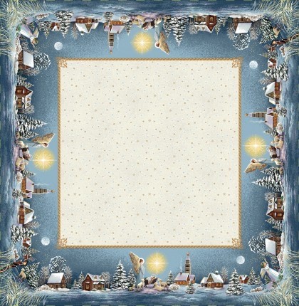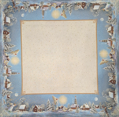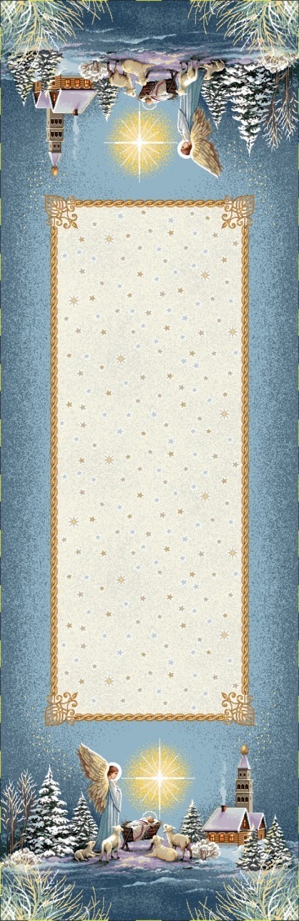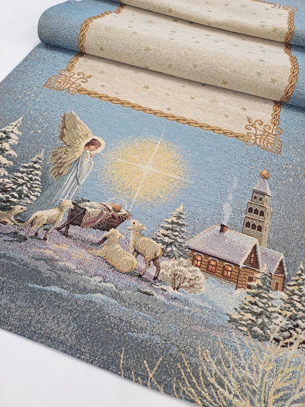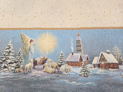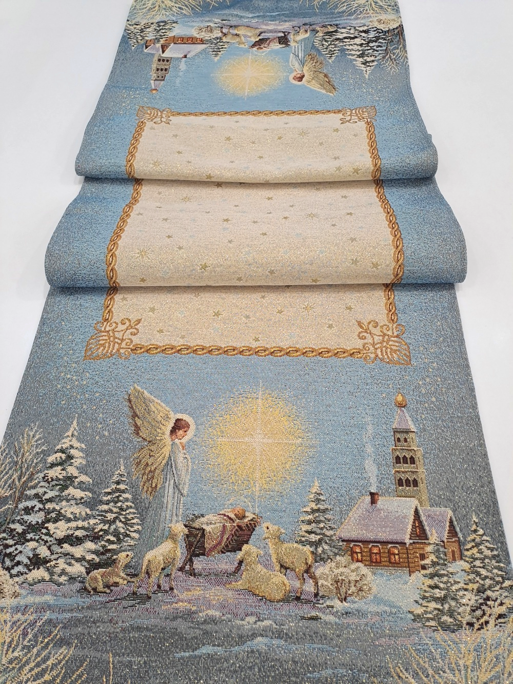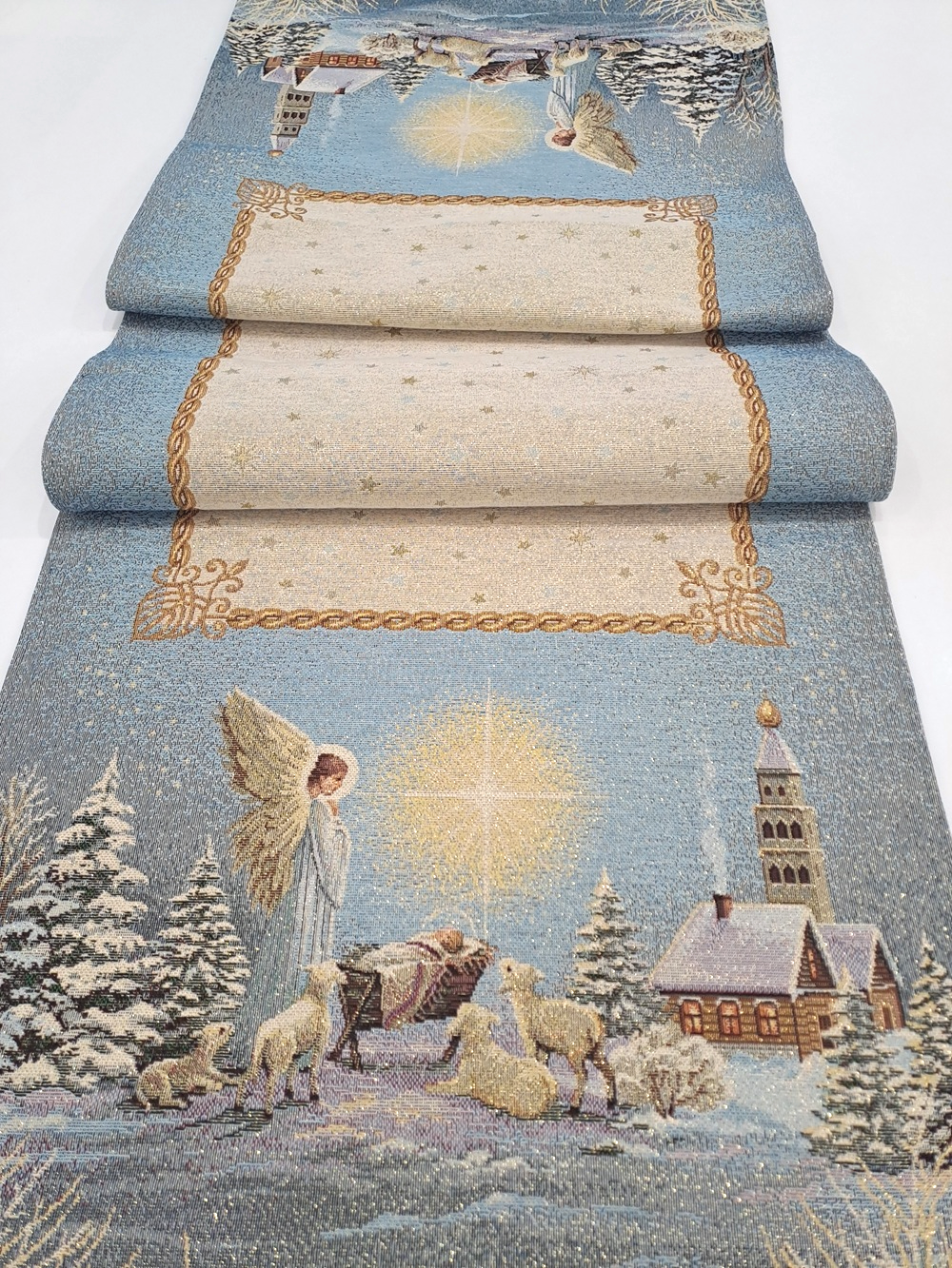 Este o față de masă goblen cu Nașterea Domnului în chenar albastru.