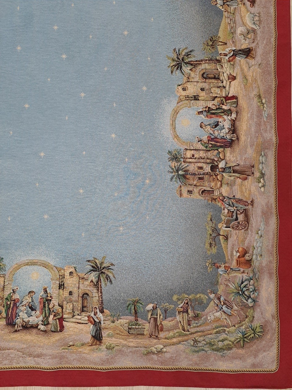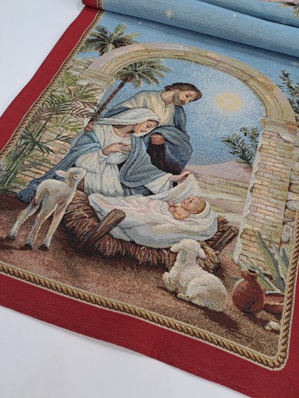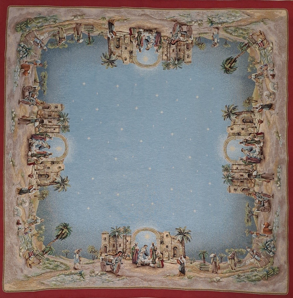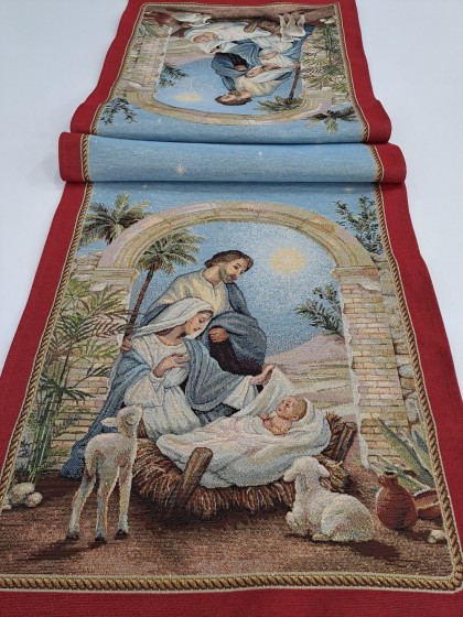 Este o față de masă din țesătură tip goblen pe fond gri albăstrui cu Nașterea Mântuitorului în chenar roșu bordo.