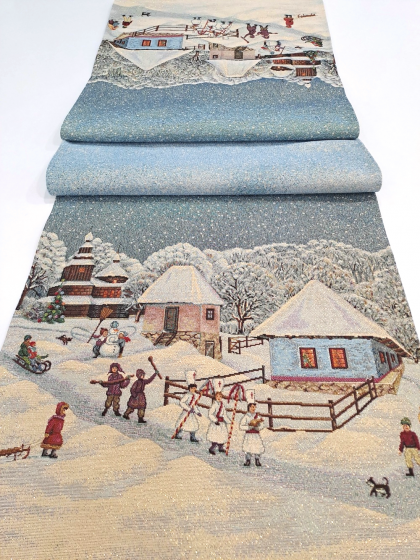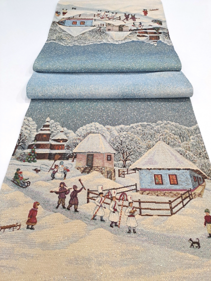 Este o traversă de Crăciun din țesătură tip goblen pe fond albastru cu peisaj de iarnă.