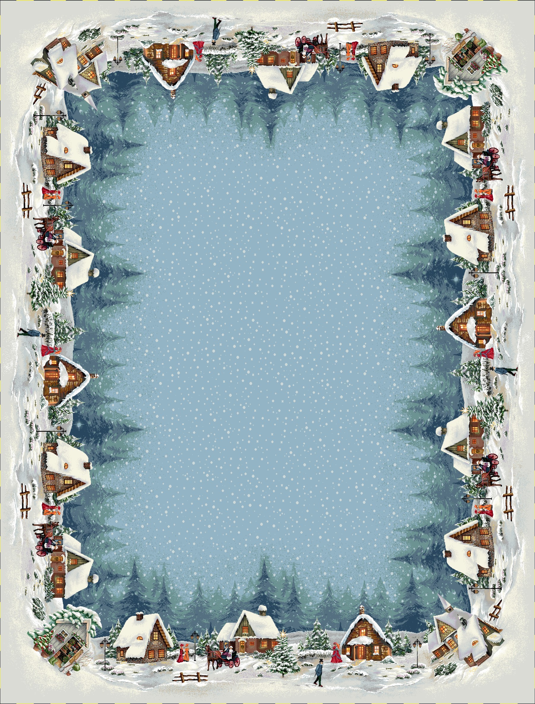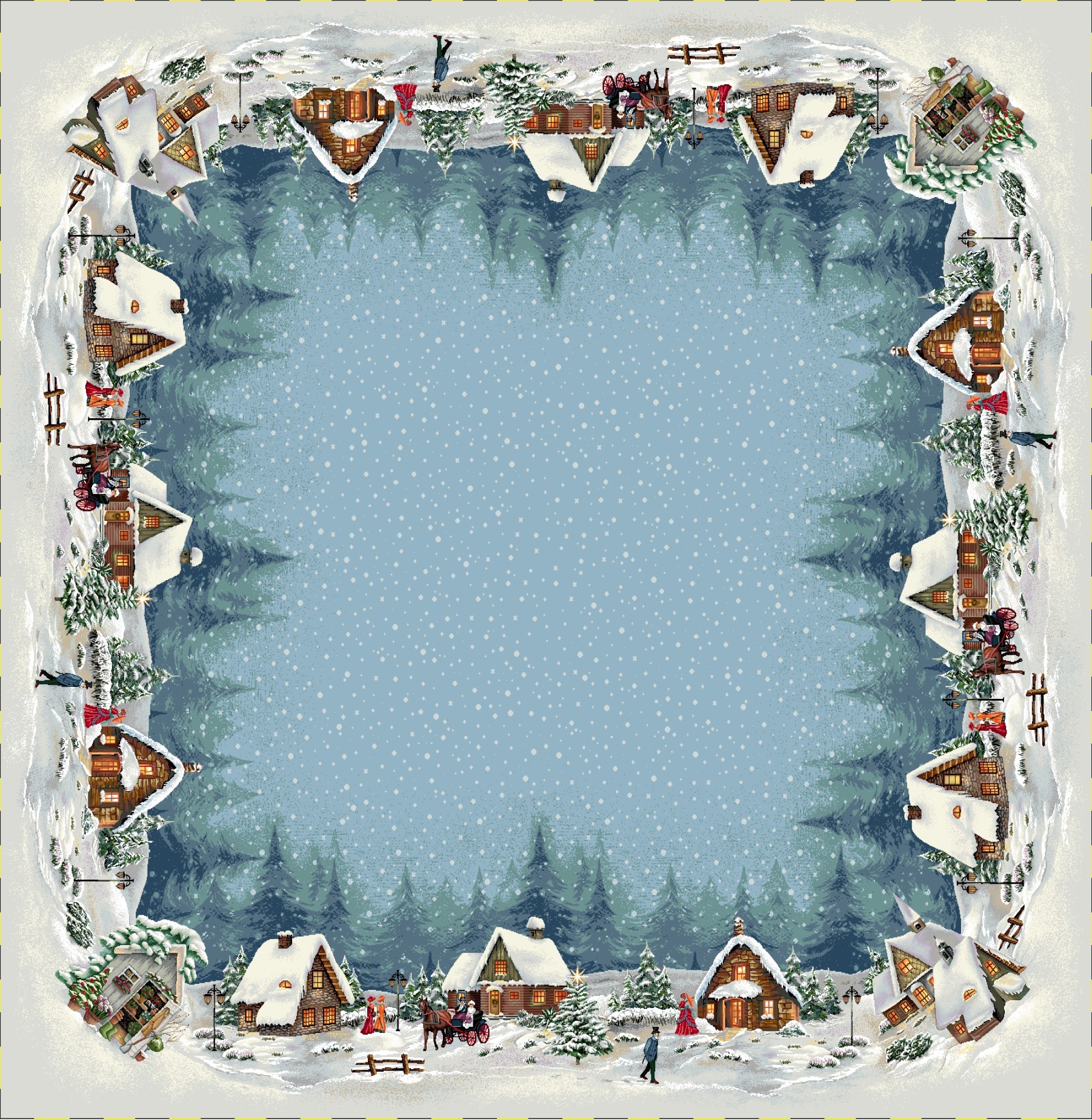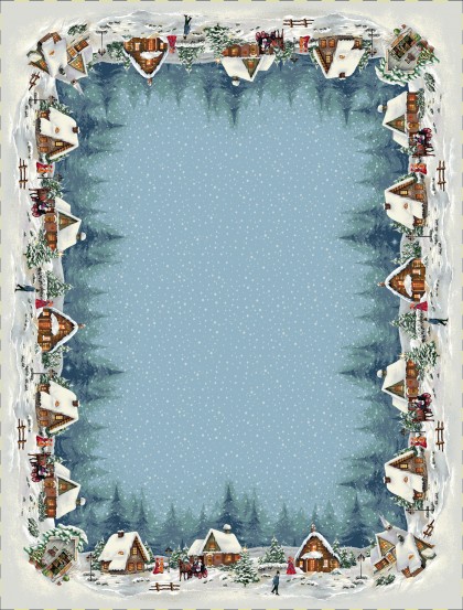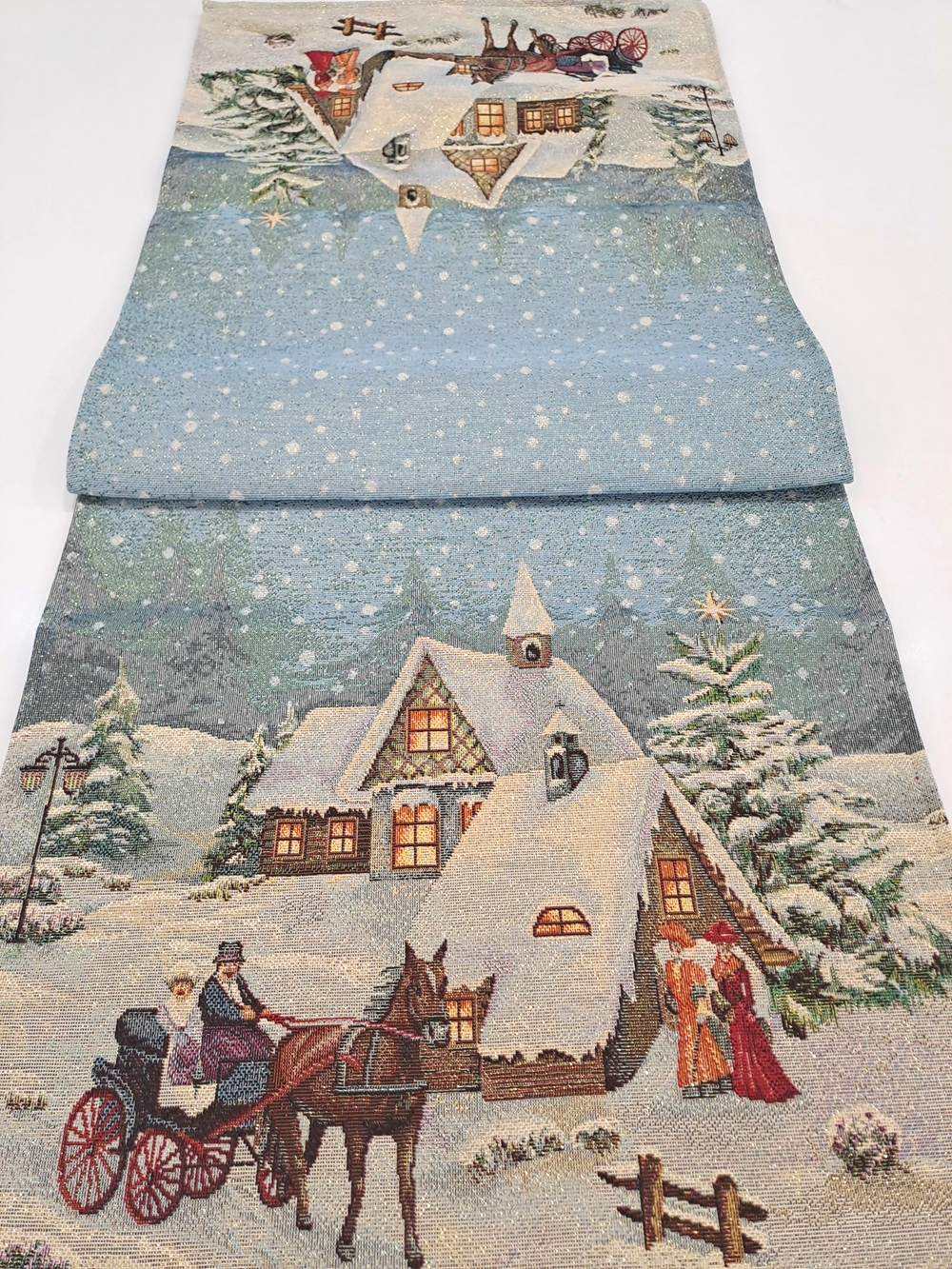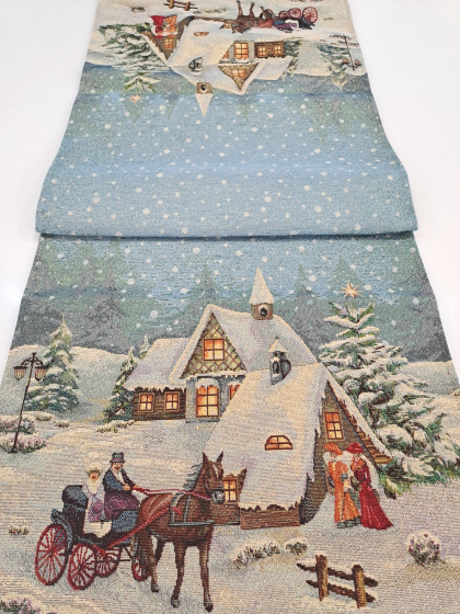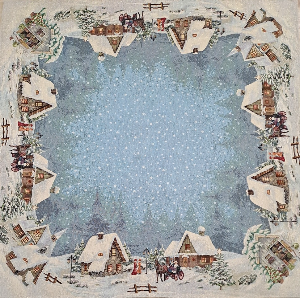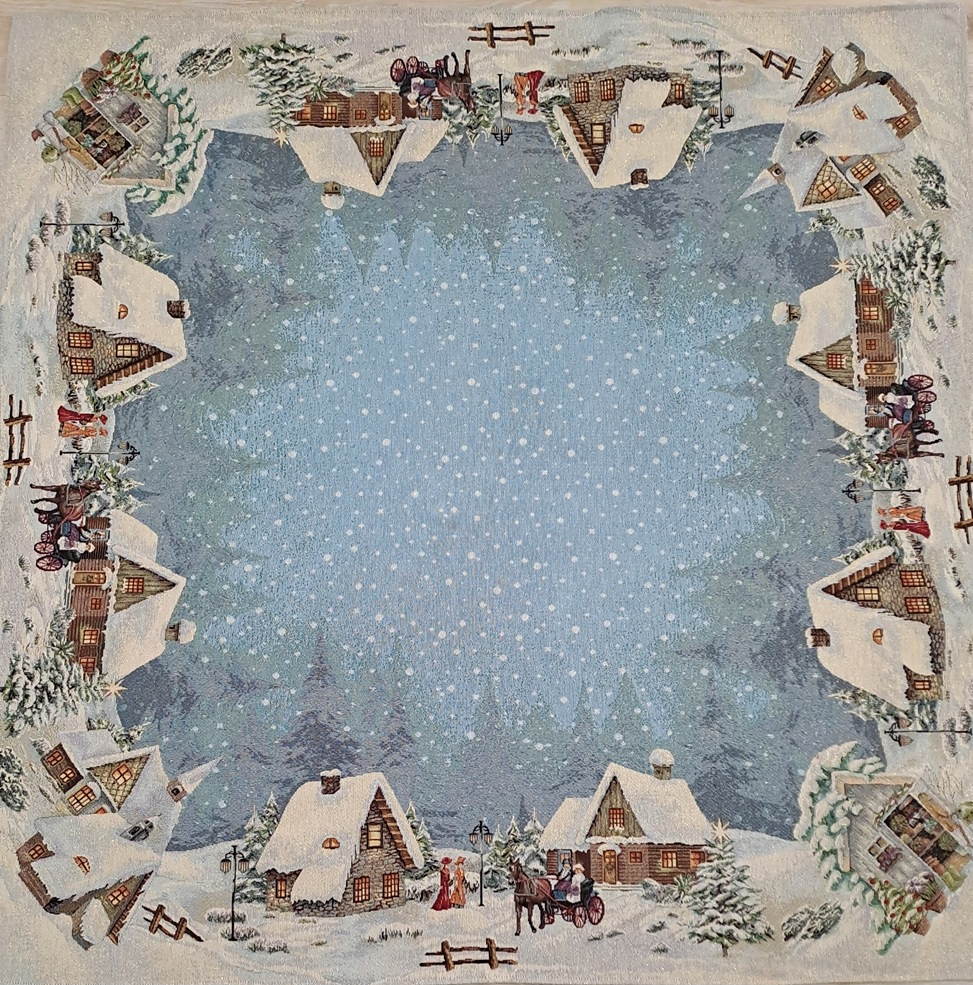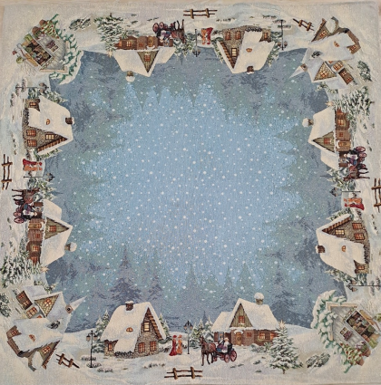 Este o față de masă din țesătură tip goblen cu peisaj de iarnă pe fond albastru.