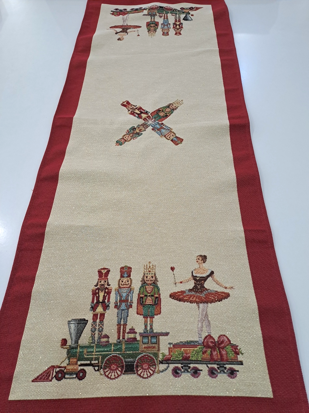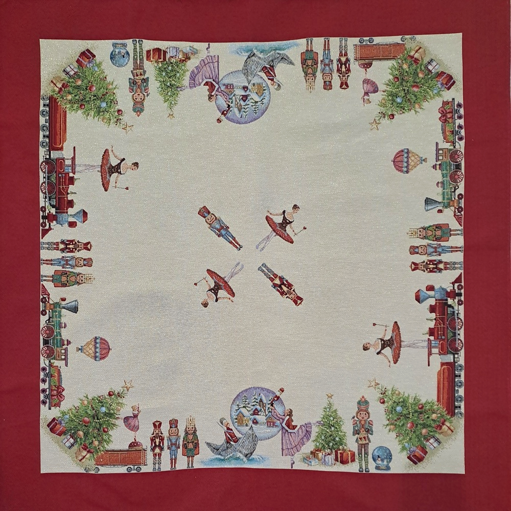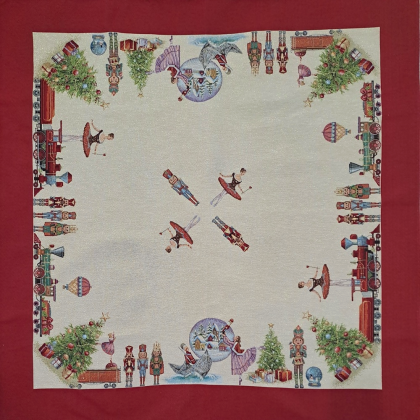 Este o față de masă din țesătură tip goblen pe fond crem cu fir lame auriu cu Spărgătorul de nuci. Pe margini este încadrată într-un chenar roșu.