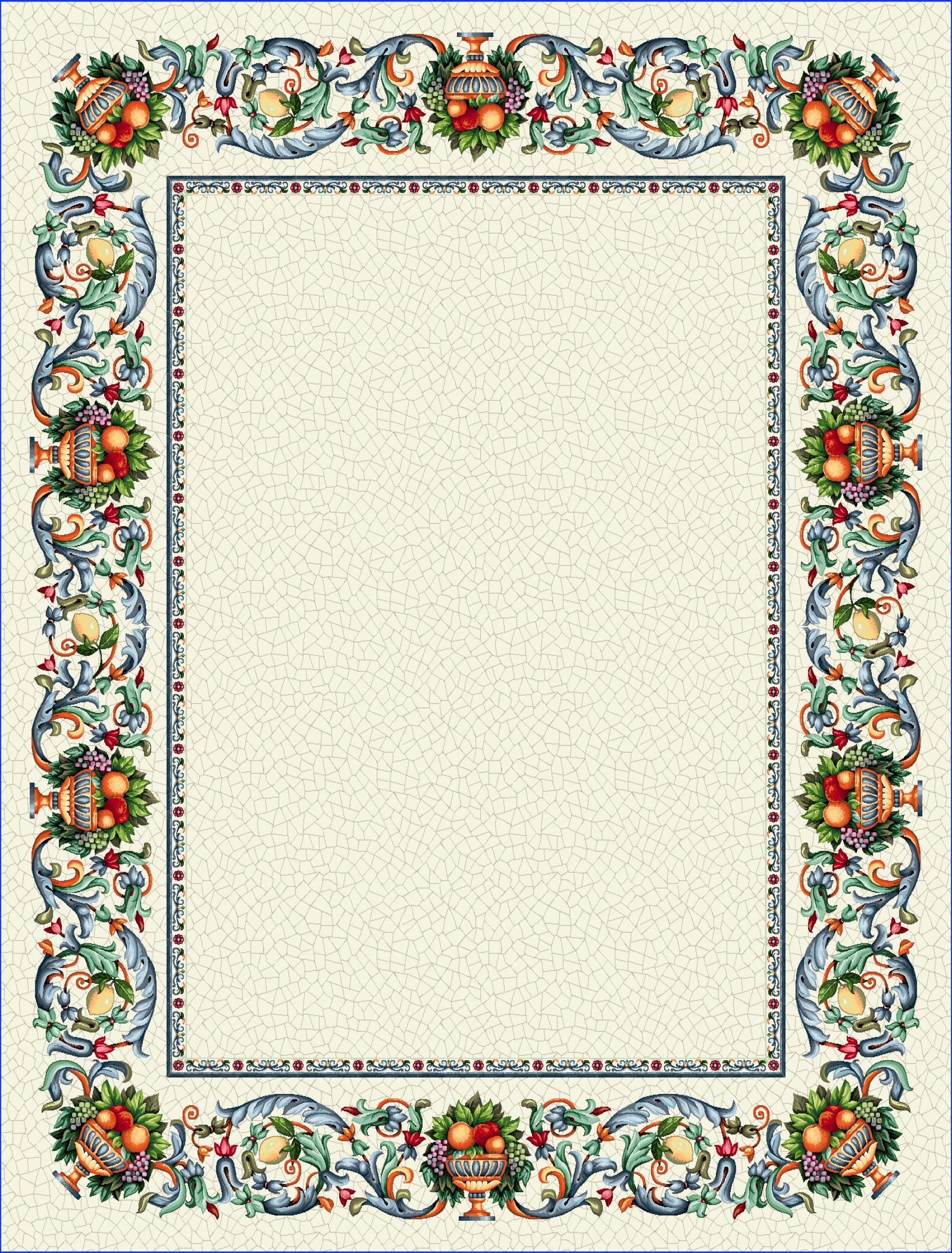 Este o față de masă din goblen crem cu fructe și ghirlande de frunze. Modelul este dispus marginal sub formă de chenar.