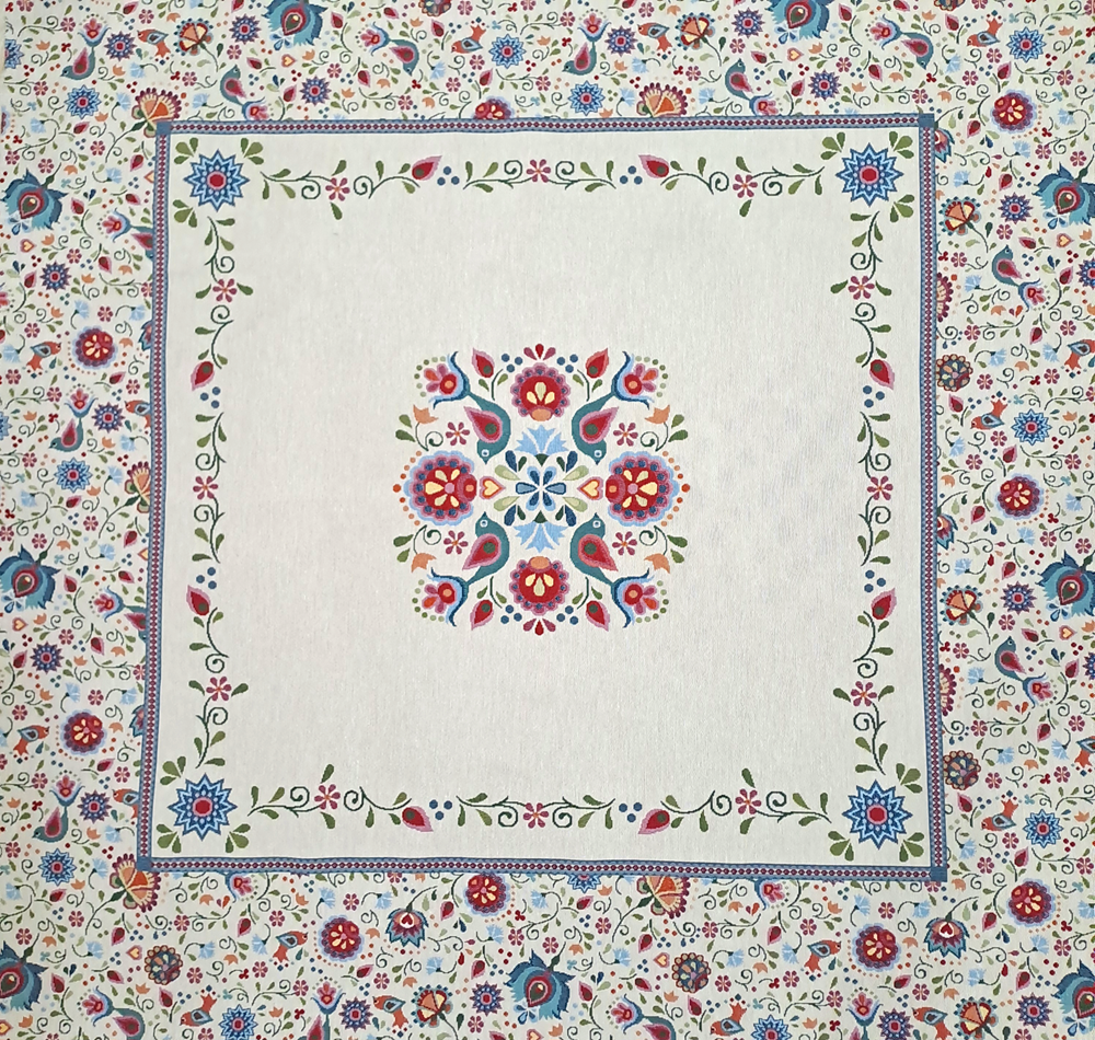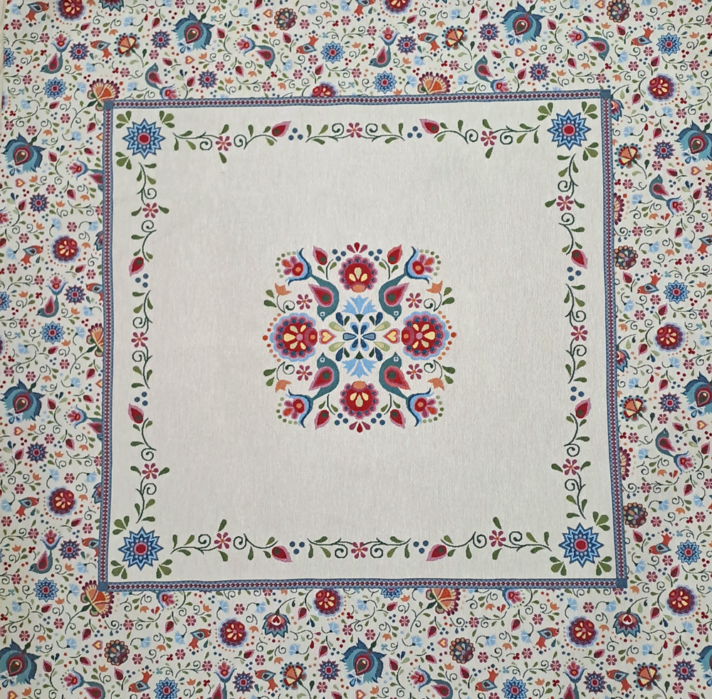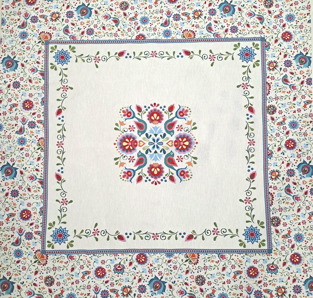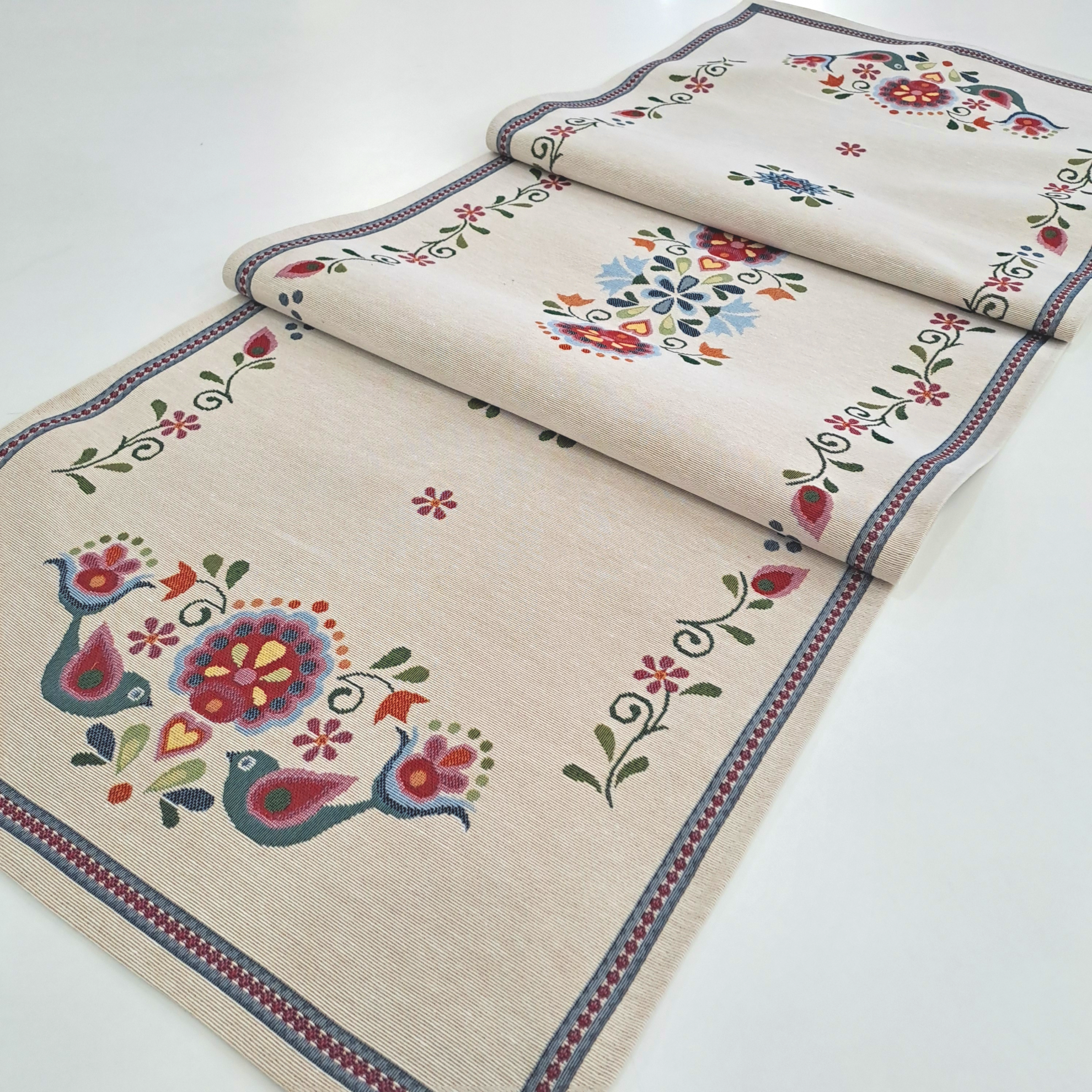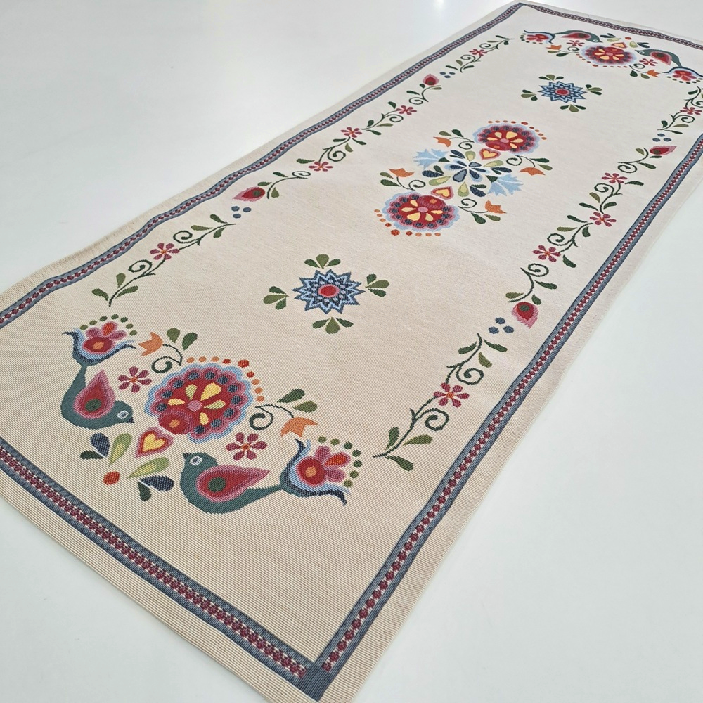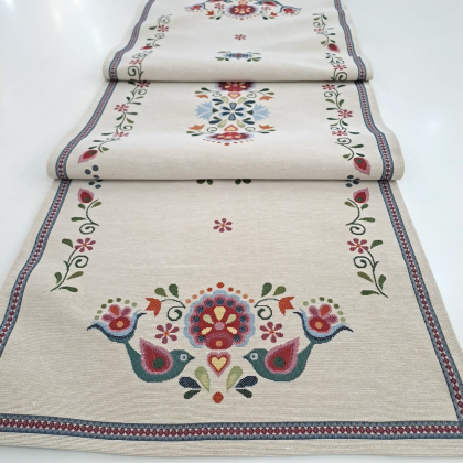 Este o față de masă din goblen pe fond crem cu model rustic unguresc.