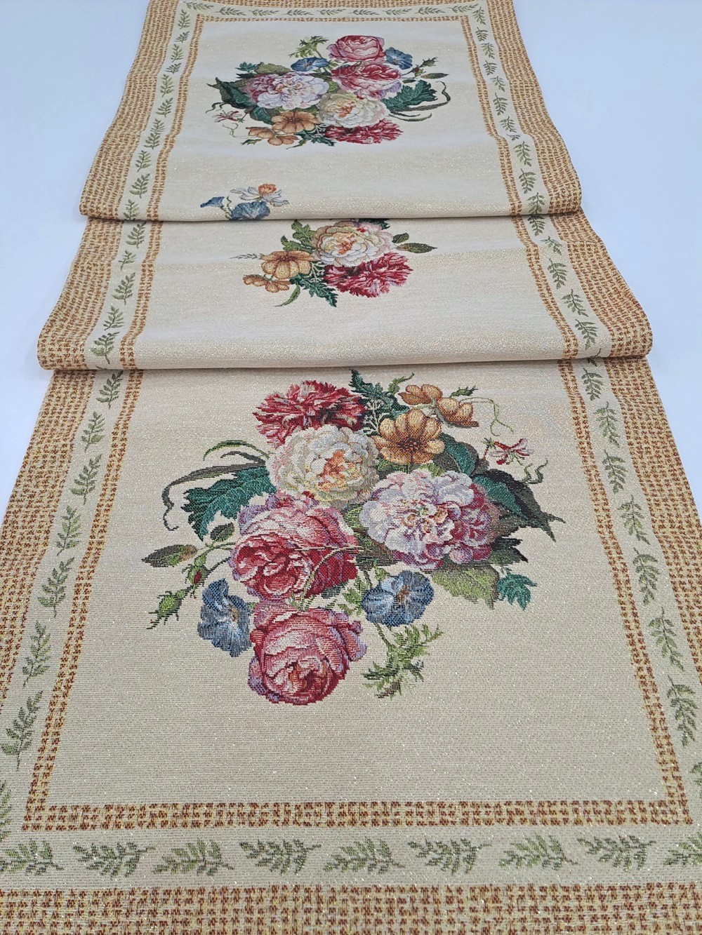 Este o față de masă crem din țesătură tip goblen cu model floral încadrat în chenar muștar.