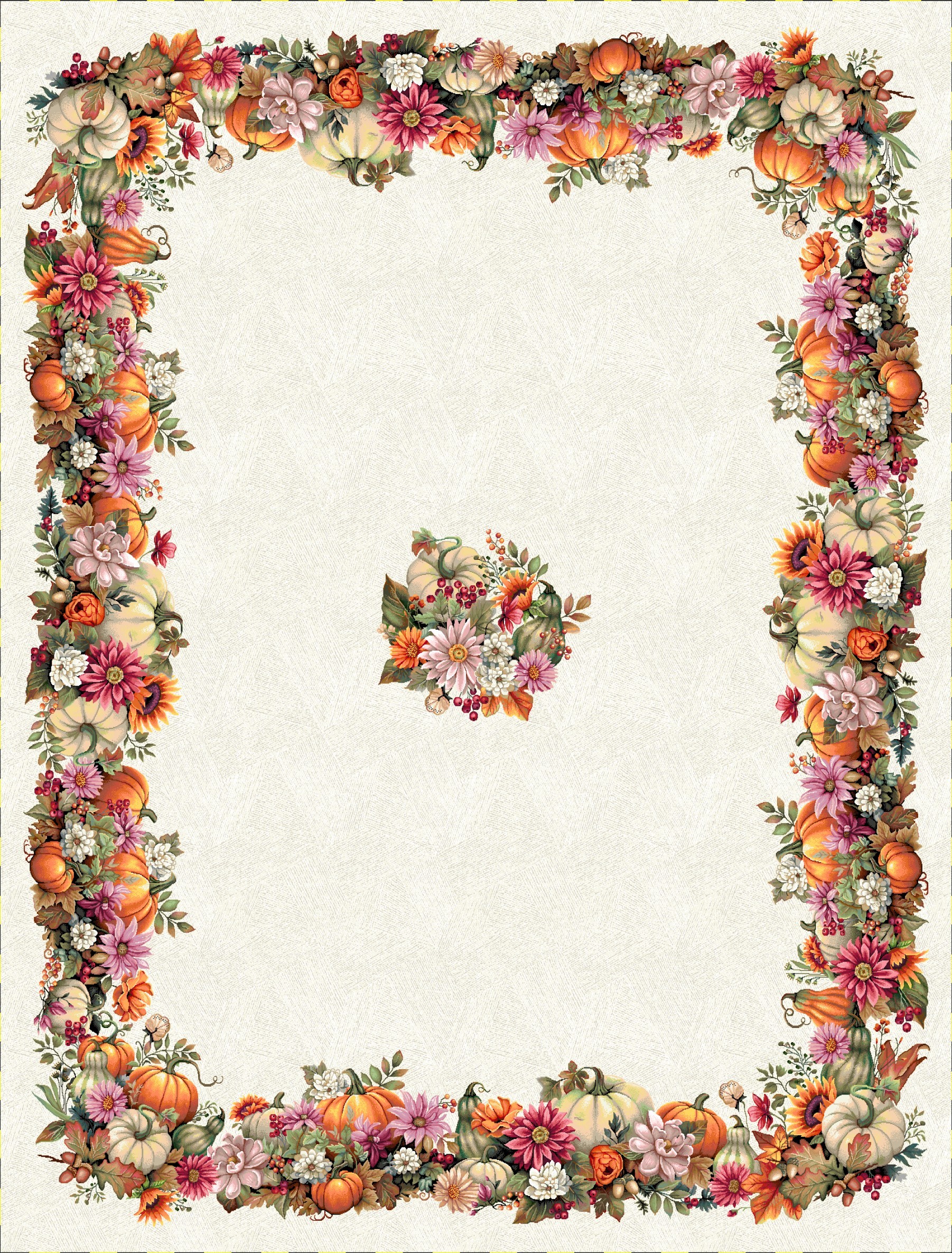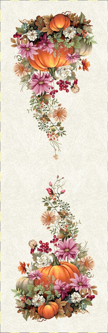 Față de masă crem texturat din țesătură tip goblen cu dovleci și flori colorate.