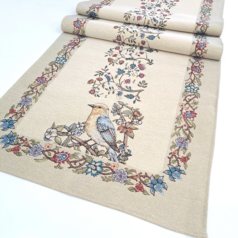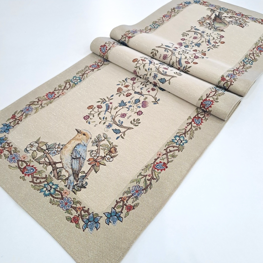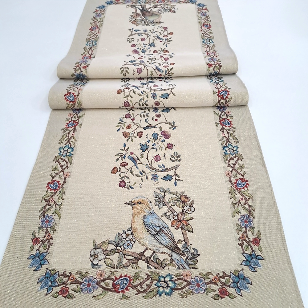 Este o față de masă din țesătură tip goblen natur cu flori și păsări.