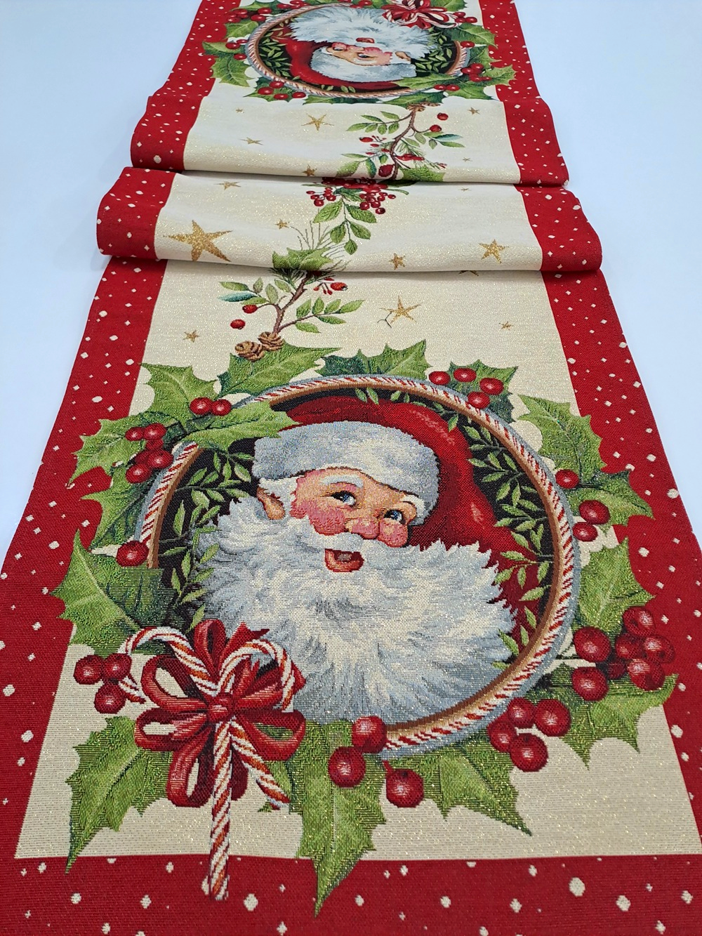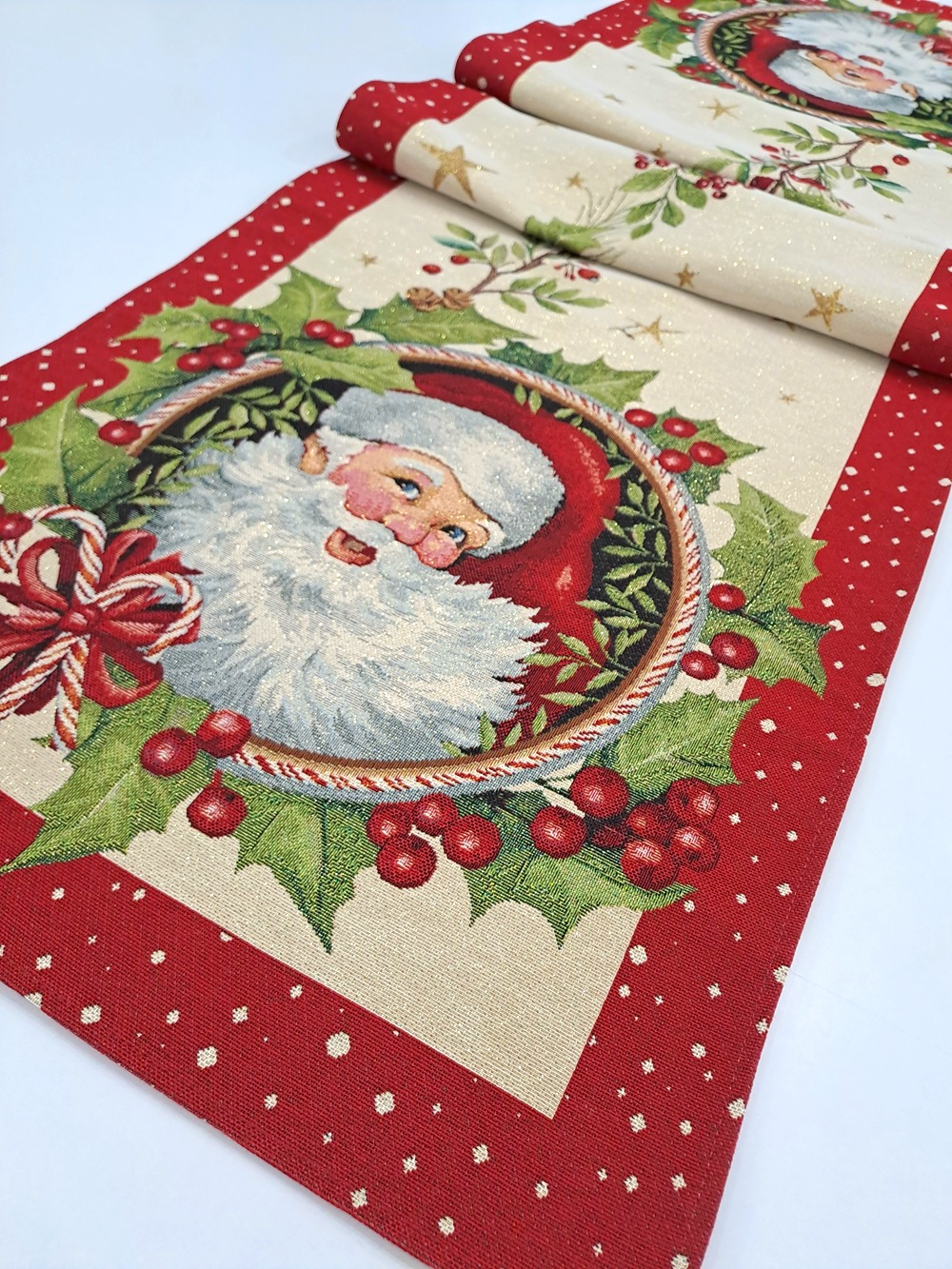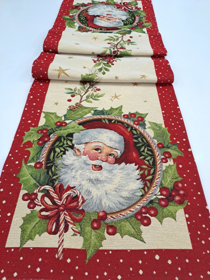 Este o față de masă crem cu Moș Crăciun și ghirlande. Decorul este încadrat într-un chenar roșu-bordo.