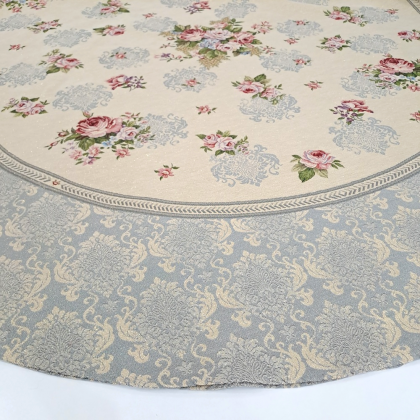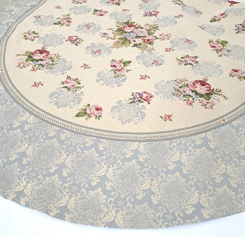 Este o față de masă ovală din țesătură tip goblen natur cu baroc gri albăstrui și trandafiri.