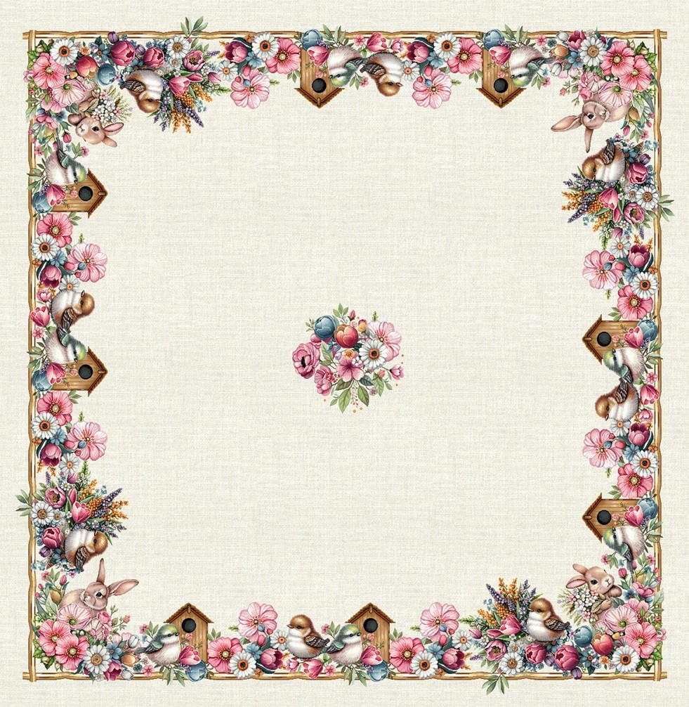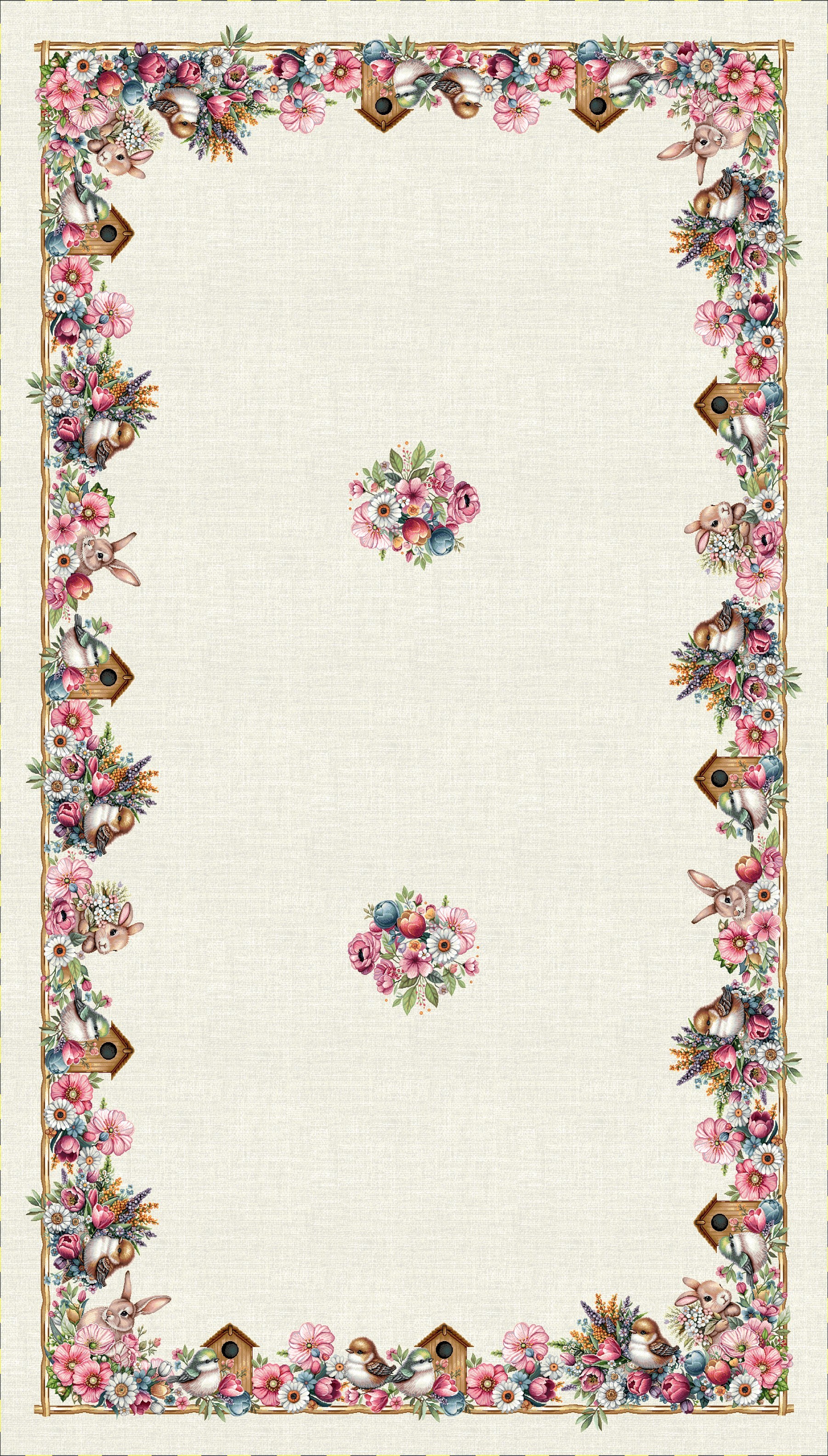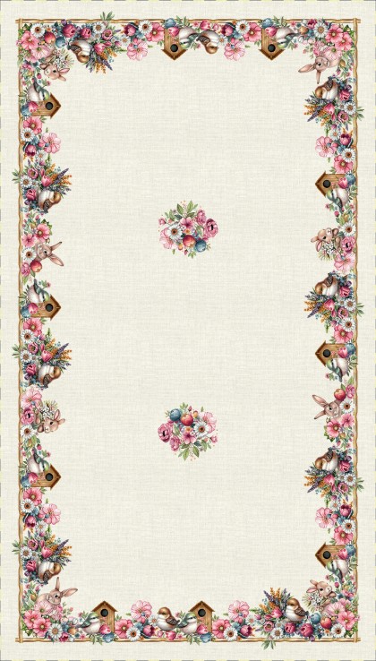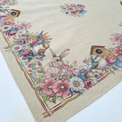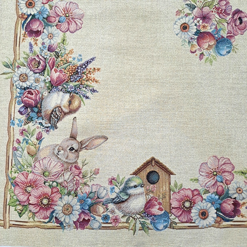 Este o față de masă din șesătură tip goblen crem texturat cu bej cu iepurași, flori viu colorate și colivii.