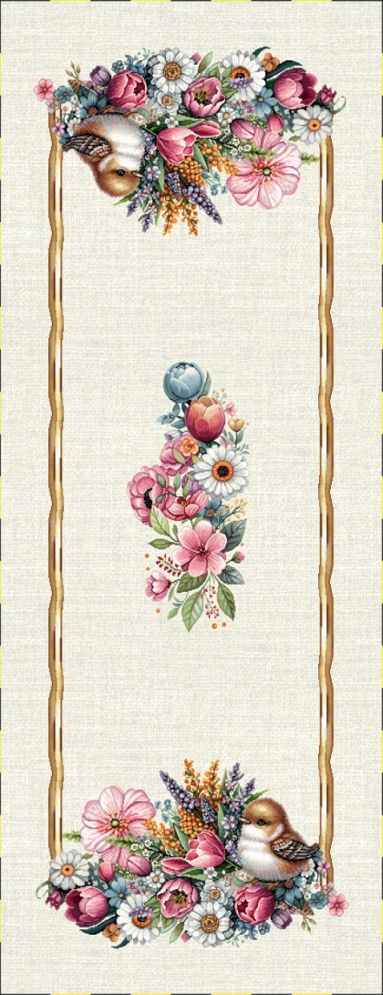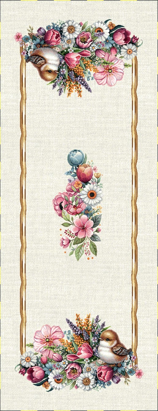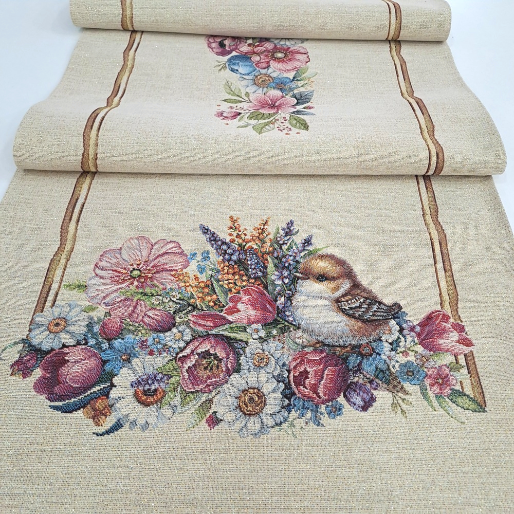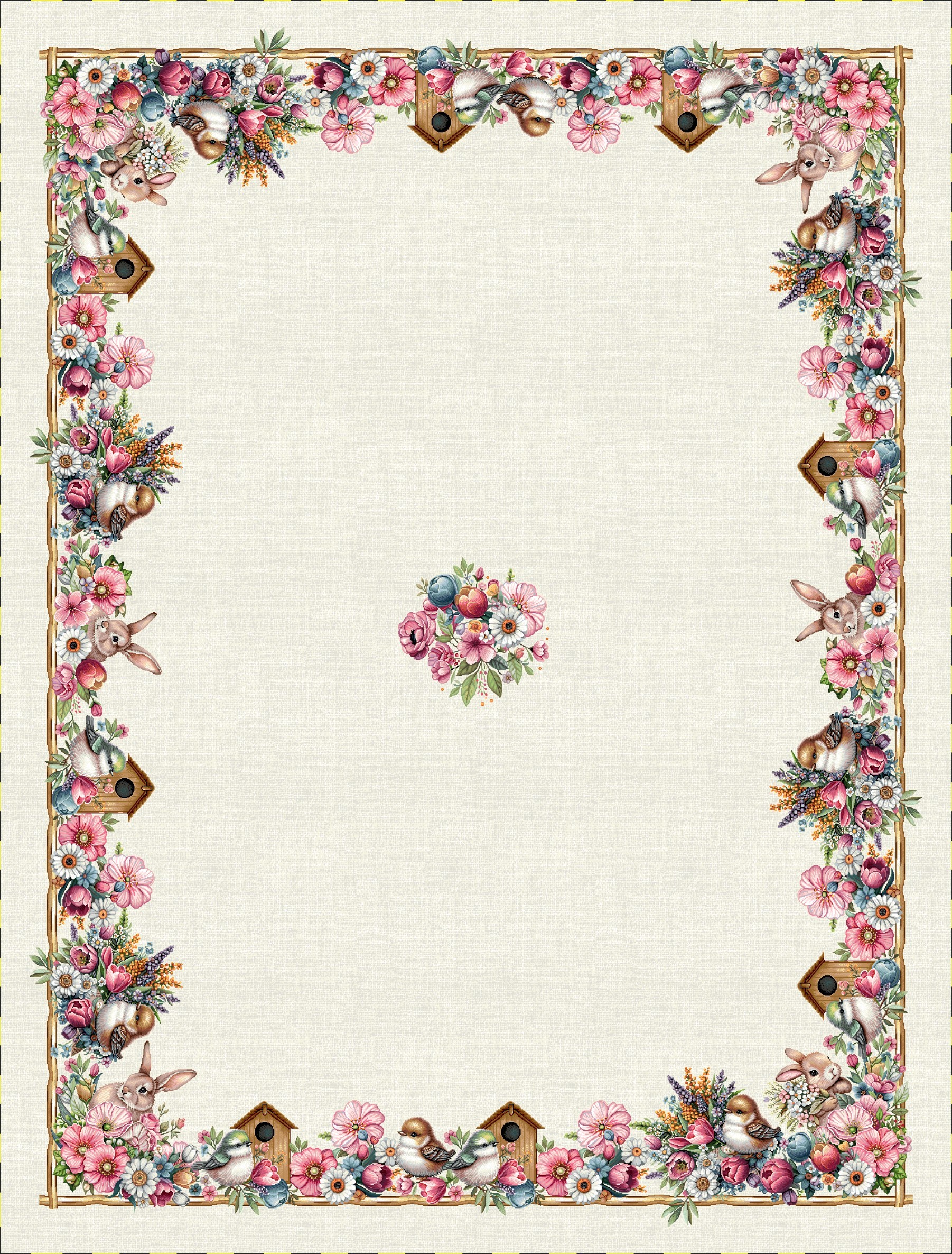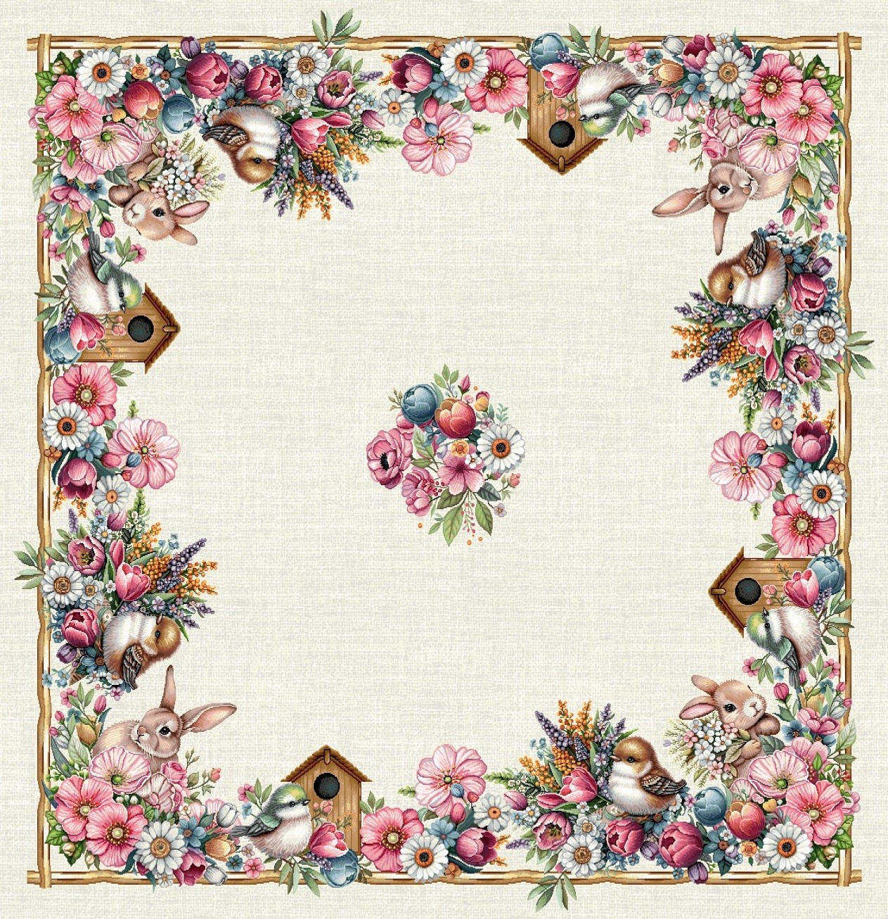 Este o față de masă din șesătură tip goblen crem texturat cu bej cu iepurași, flori viu colorate și colivii.
