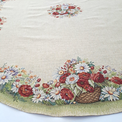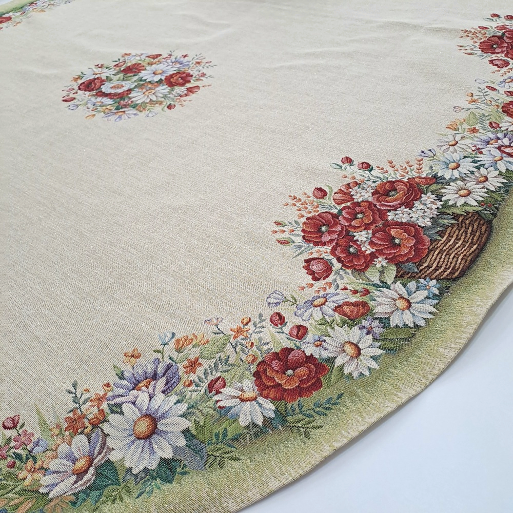 Este o față de masă ovală din țesătură tip goblen pe fond crem texturat, cu maci și margarete.