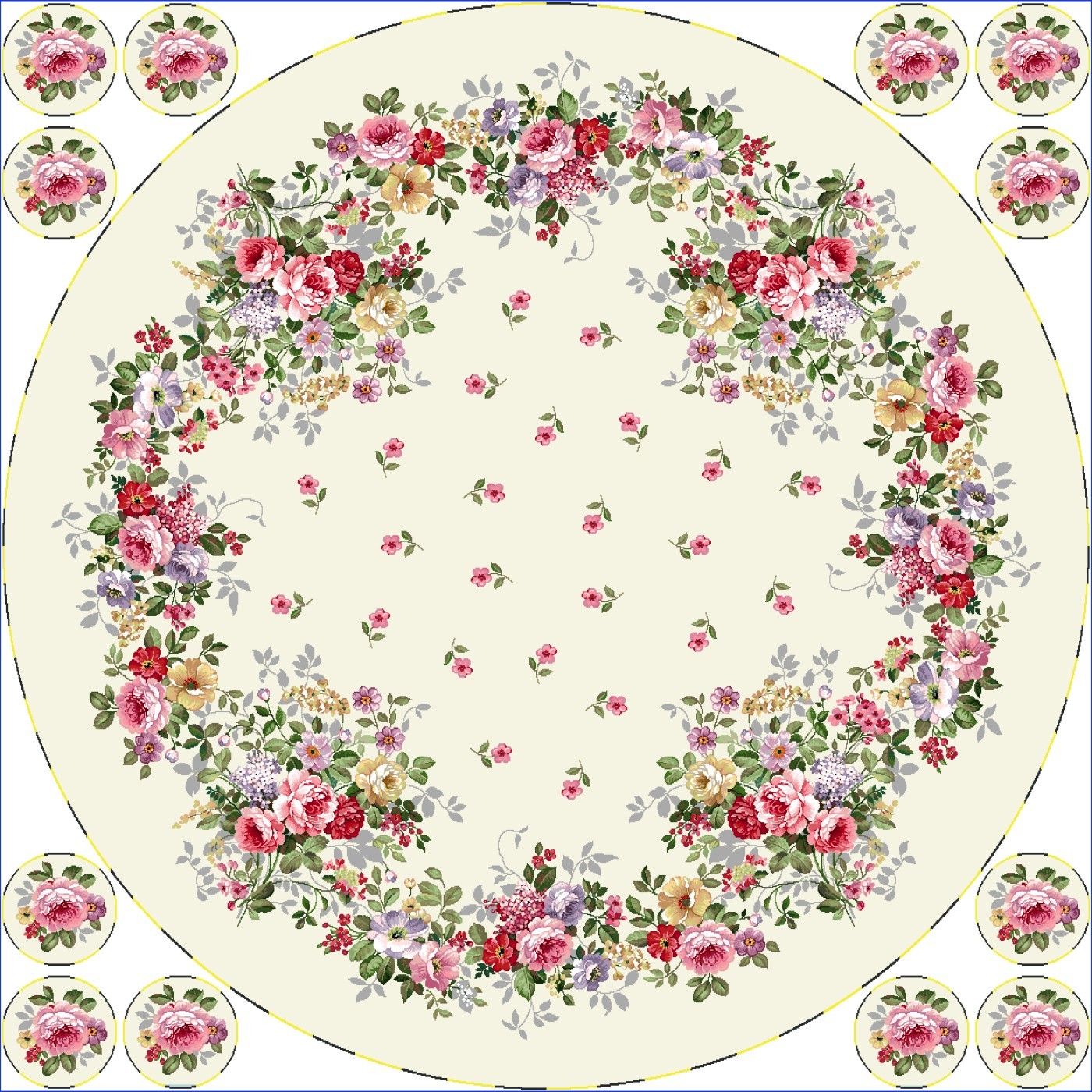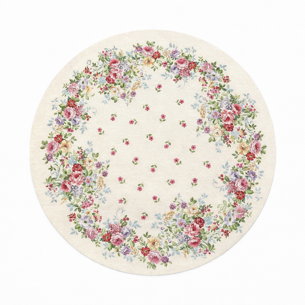 Față de masă rotundă crem cu trandafiri roz și crem.