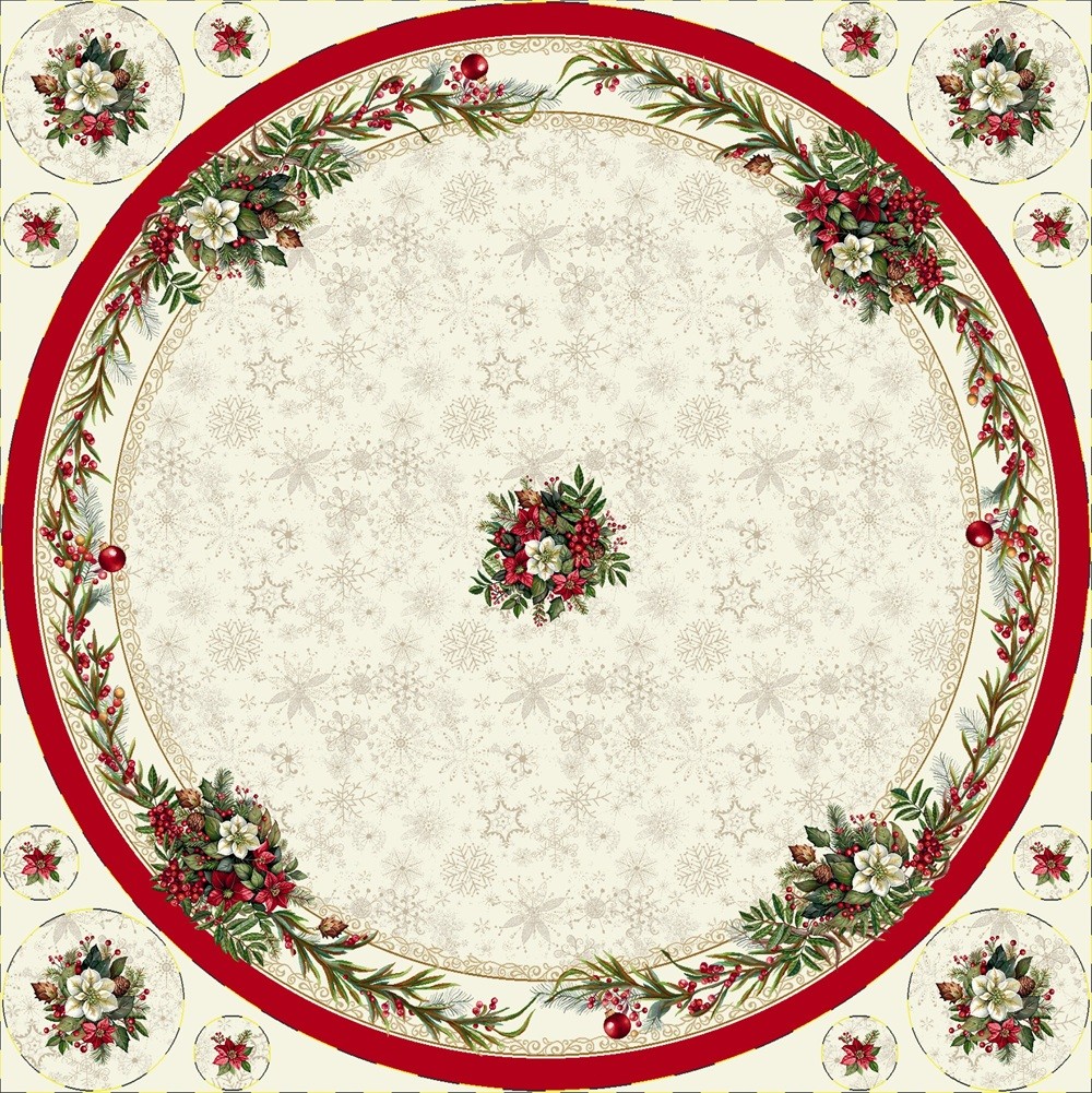 Este o față de masă rotundă din țesătură tip goblen crem cu Crăciunele și ramuri de vâsc.