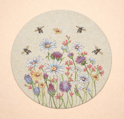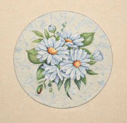 Este o traversă din țesătură tip goblen pe fond crem cu lămâi. Are fir lame auriu discret.
