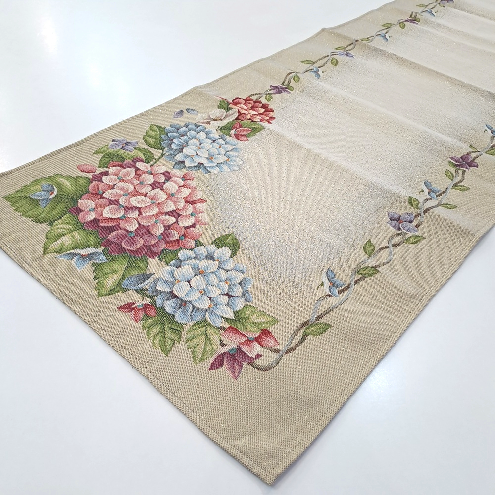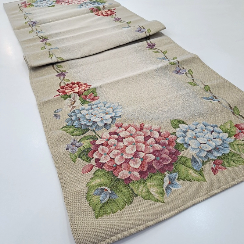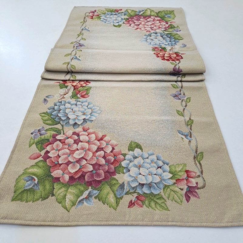 Este o traversă din țesătură tip goblen pe fond crem cu hortensii. Are fir lame auriu discret.