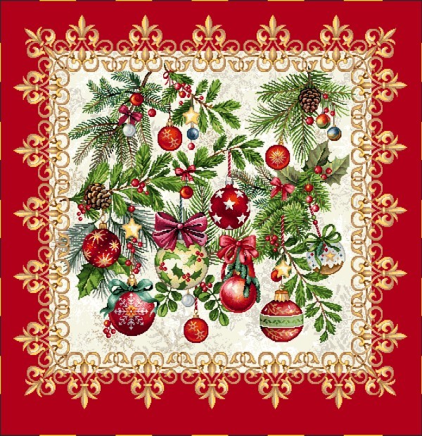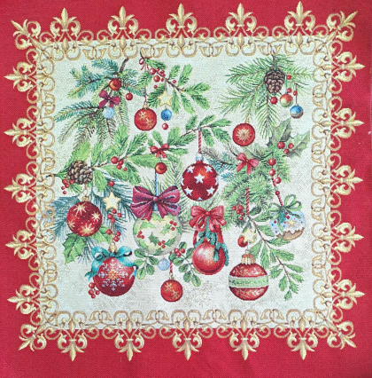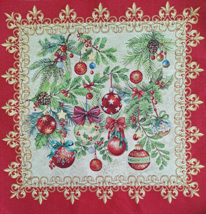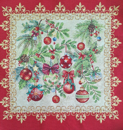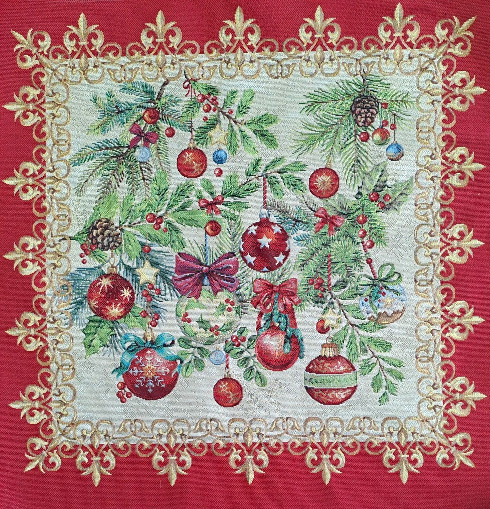 Este o față de pernă/napron din țesătură tip goblen cu ramuri de brad și globuri de Crăciun.