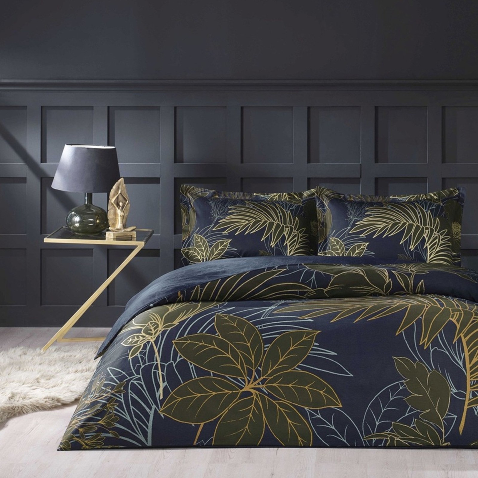 Lenjerie de pat matrimonial albastru închis cu model vegetal conturat cu bej