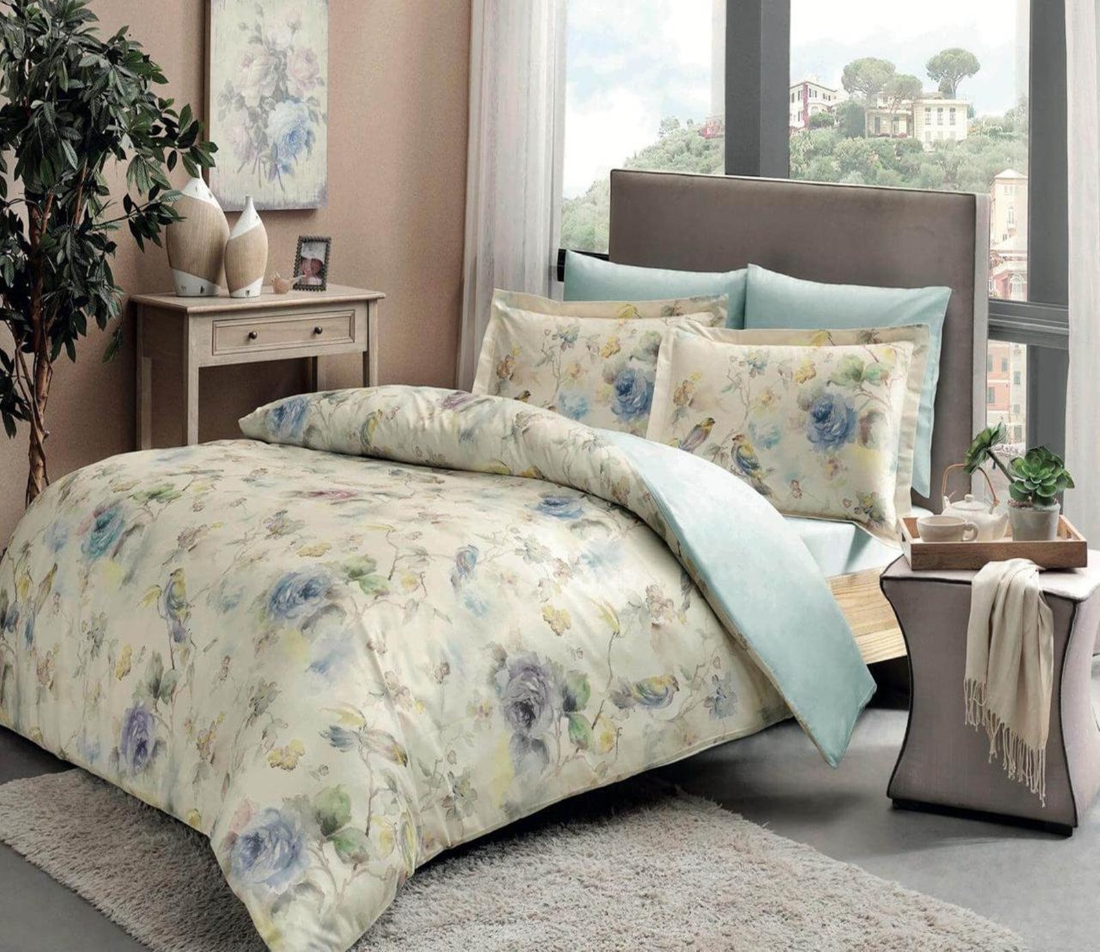 Lenjerie de pat matrimonial TAC cu două fețe de plapumă ivoar cu flori albastre