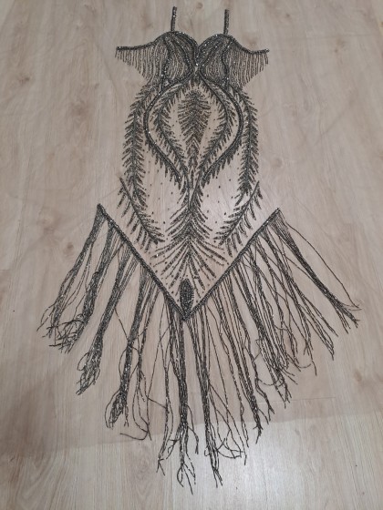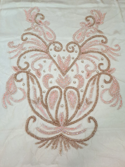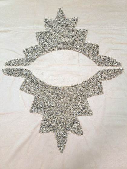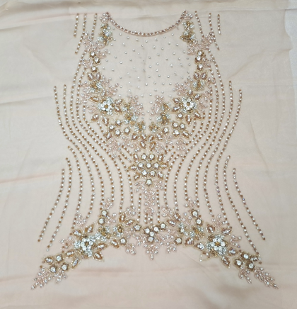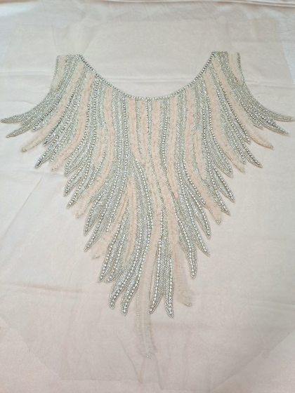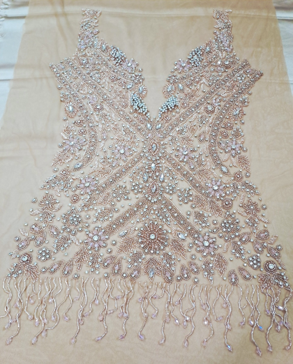 Este o vâscoză pe fond alb cu mov, cu model floral și aplicații de cristale și paiete.