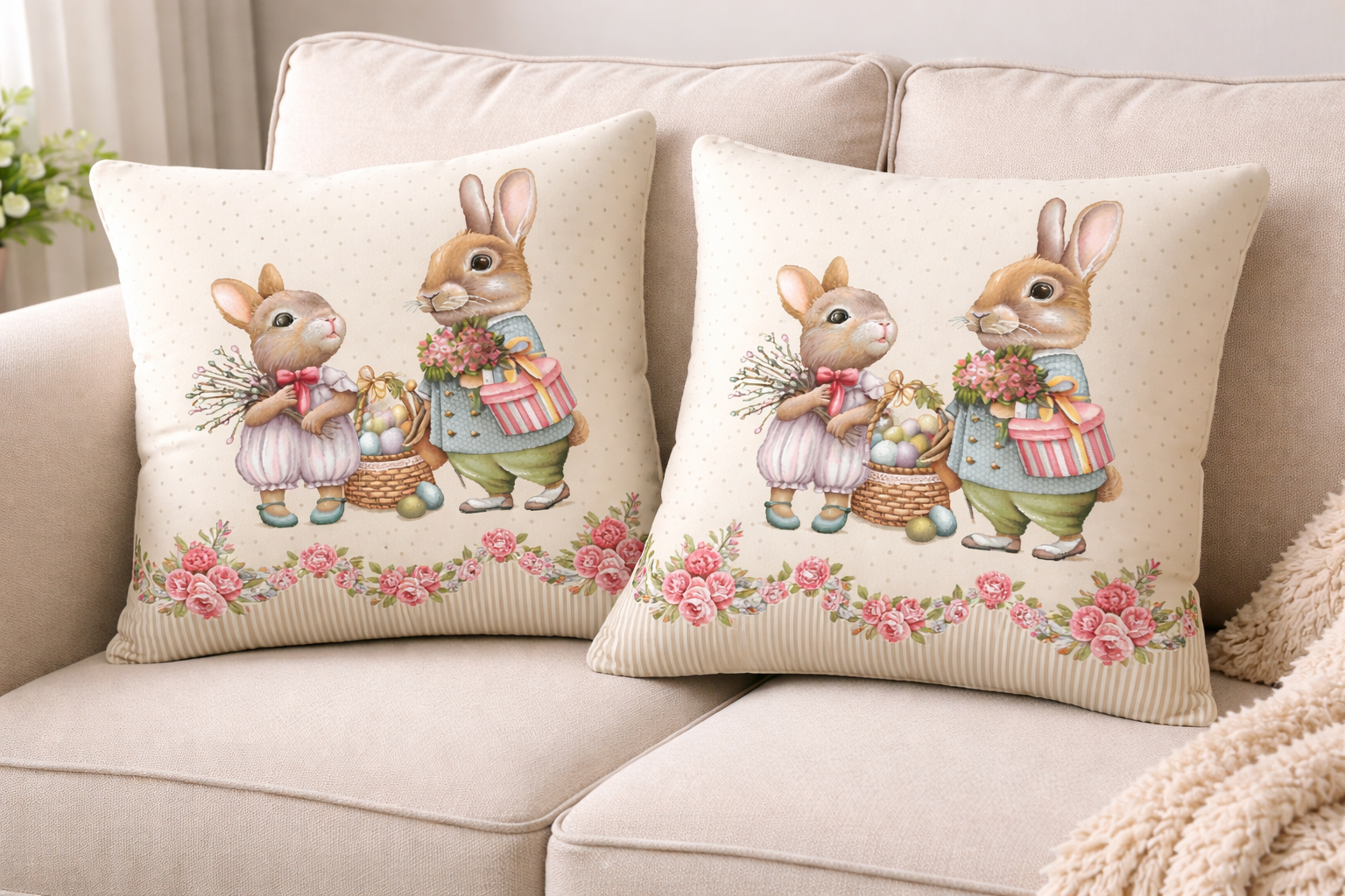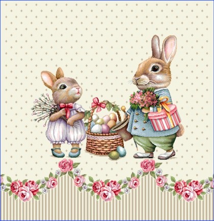 Față de pernă sau napron din goblen pe fond crem cu iepurași.
