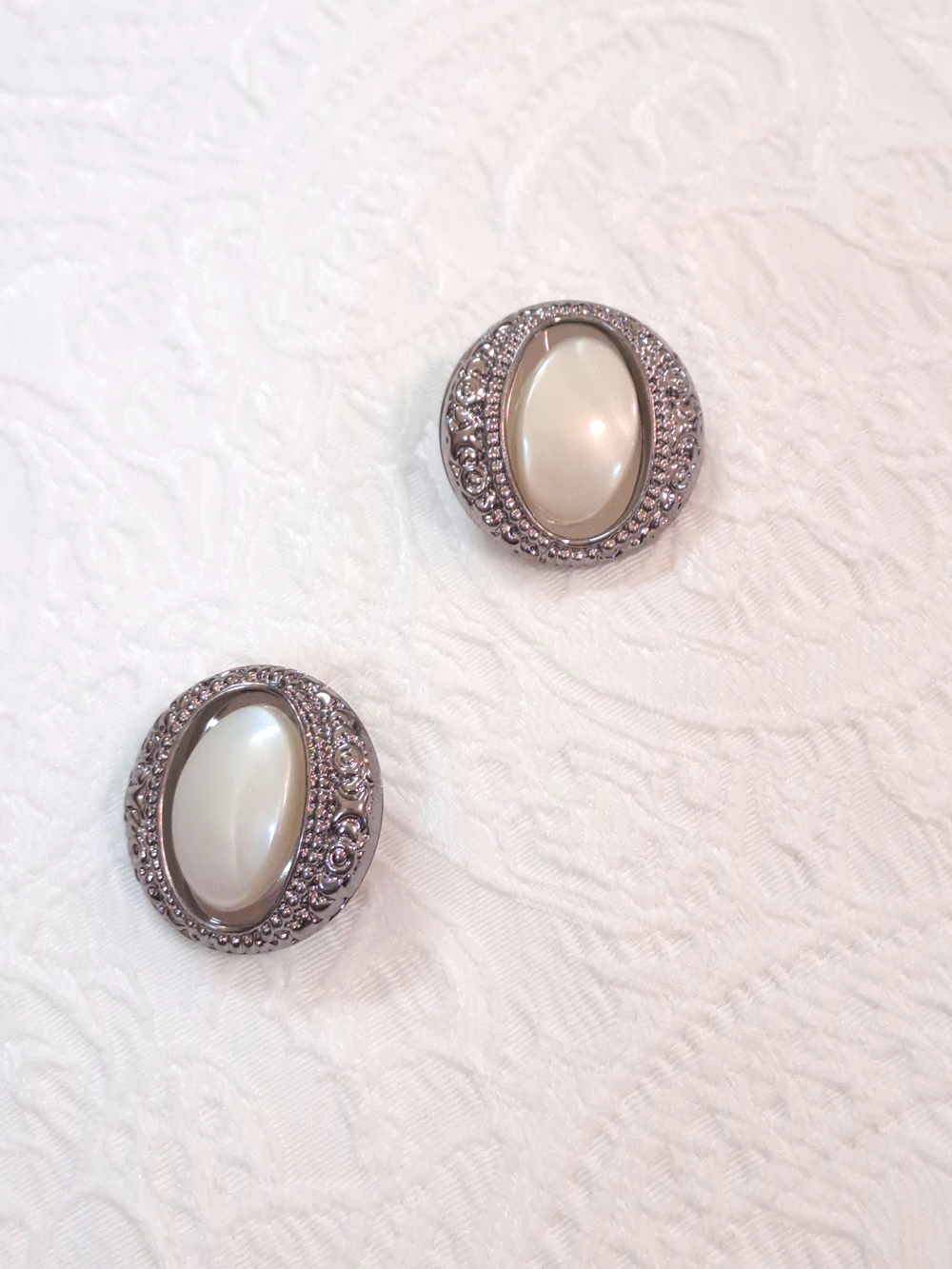 Sunt nasturi eleganți argintiu antichizat cu perlă în formă de migdală.