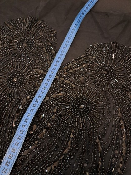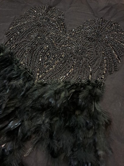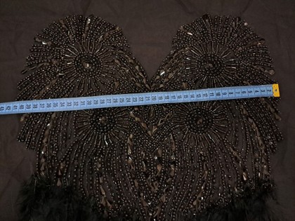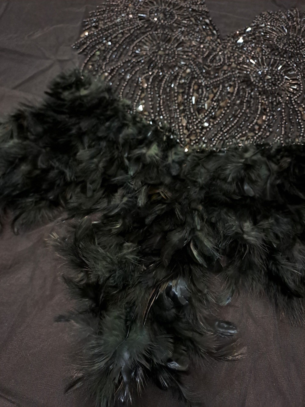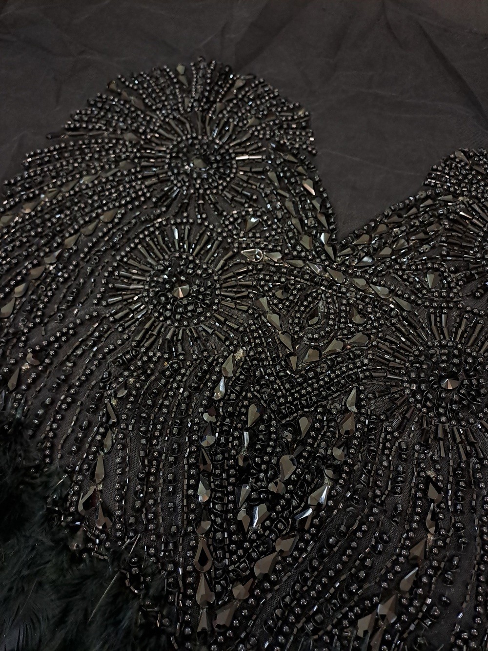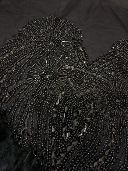 Este un panou bust pentru față accesărizat cu cristale, mărgele și pene negre pe suport de tull.