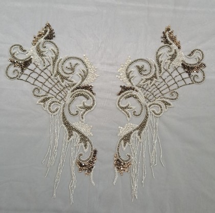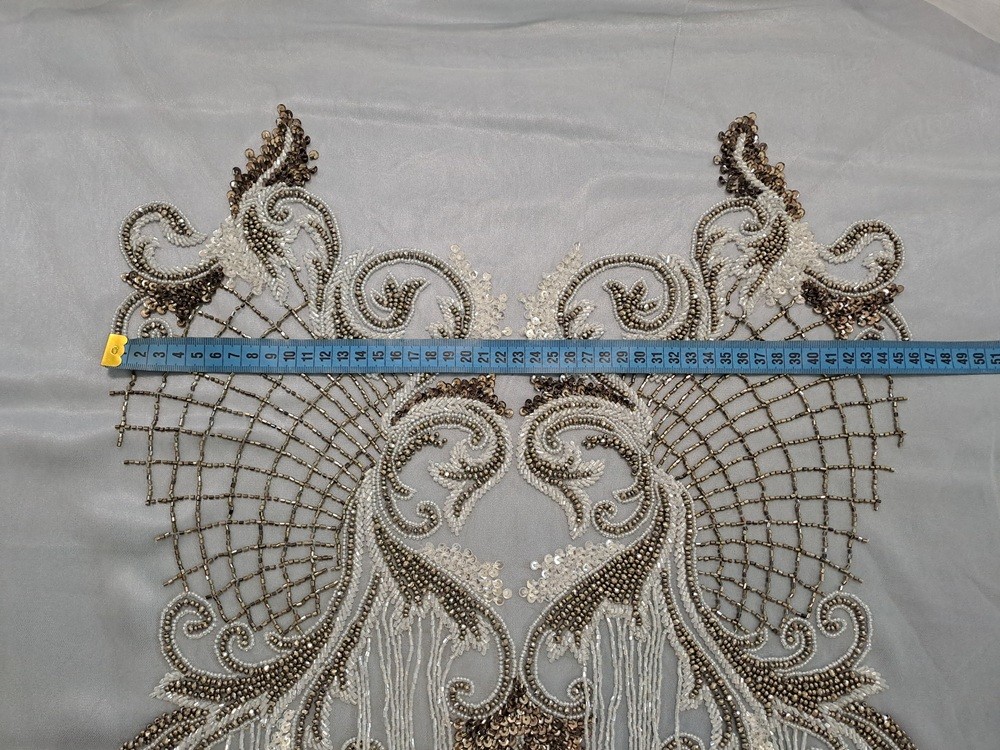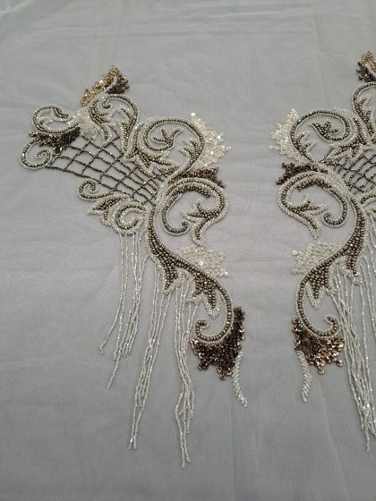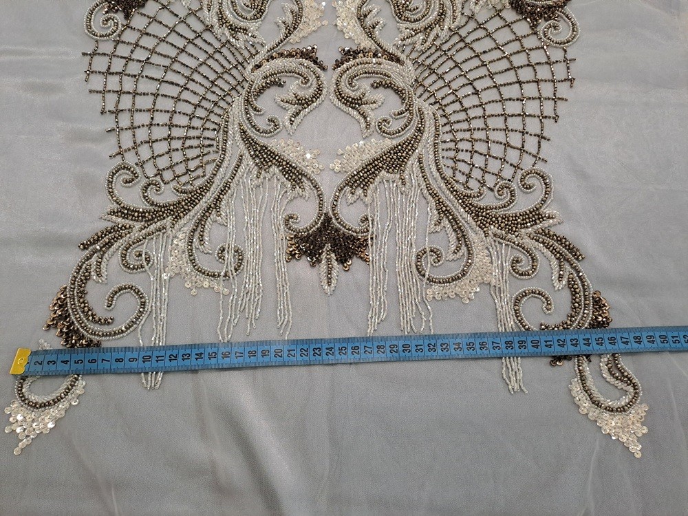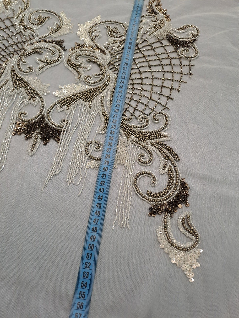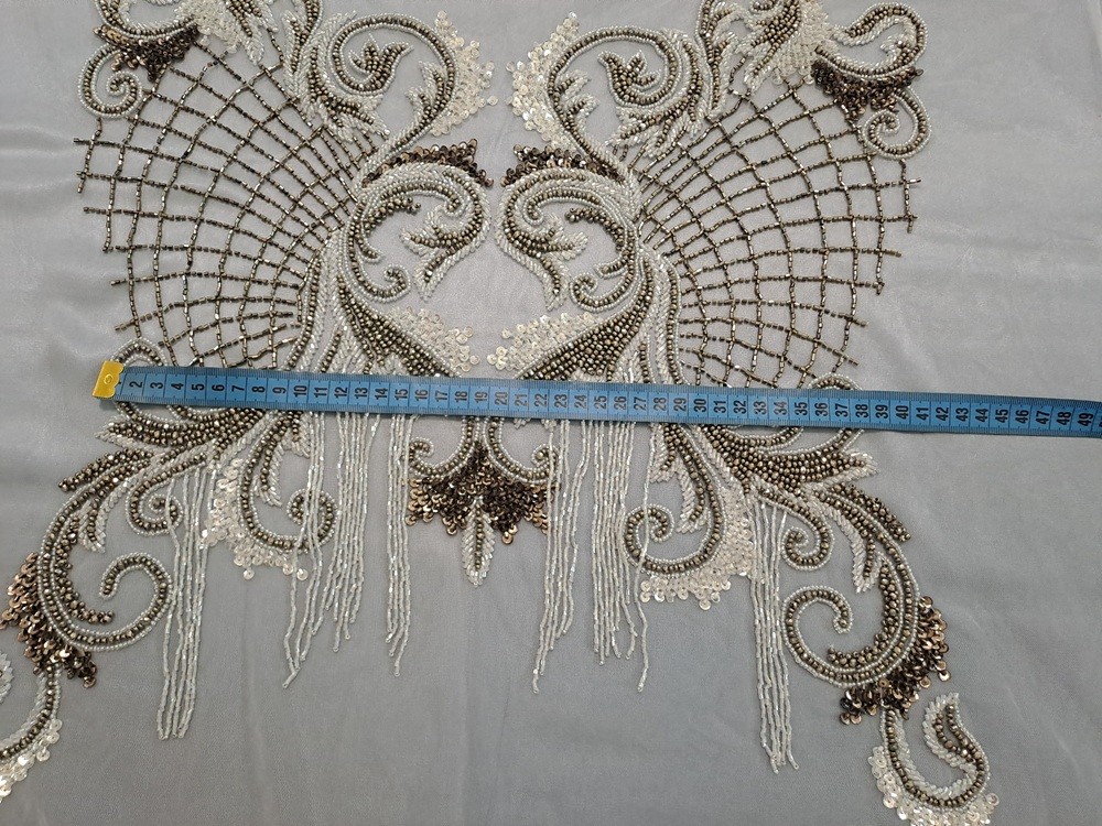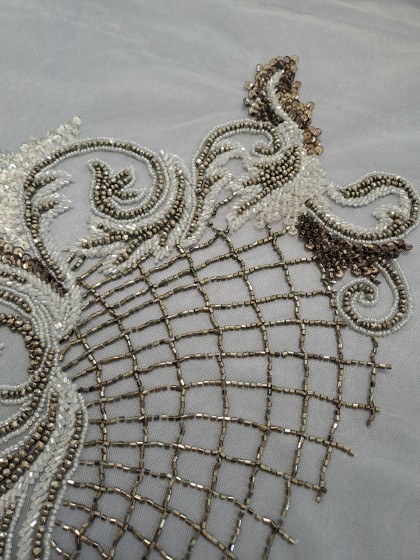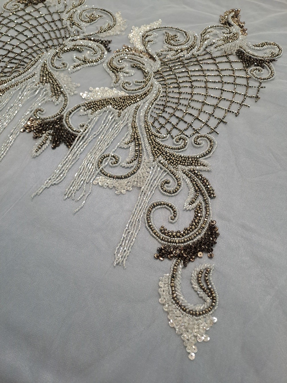 Este un panou bust pentru față/spate din mărgele argintii antichizat și albe cu franjuri pe suport de tull gri.