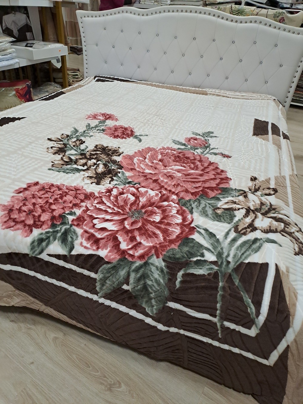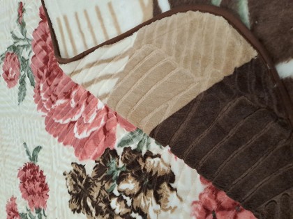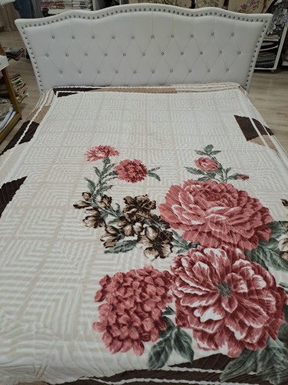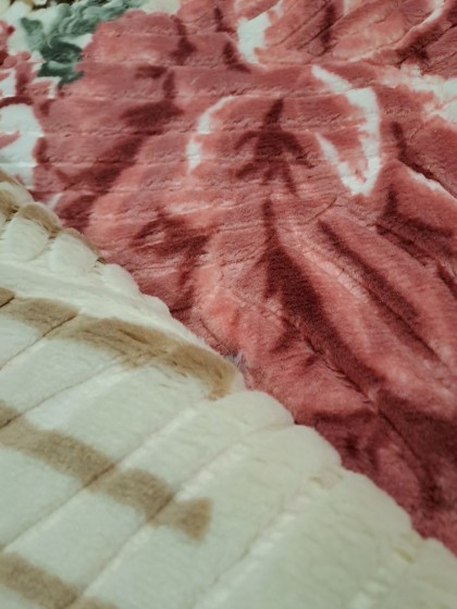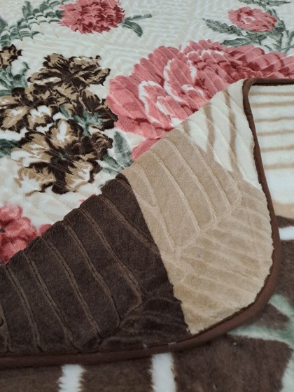 Este o pătură groasă pe fond bej cu model geometric alb și flori mari roz plămâniu.