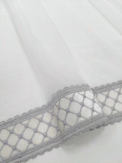 Este o perdea pe suport de tull alb brodată cu romburi gri argintiu dispuse în borduri înguste. Are inserții de catifea albă.