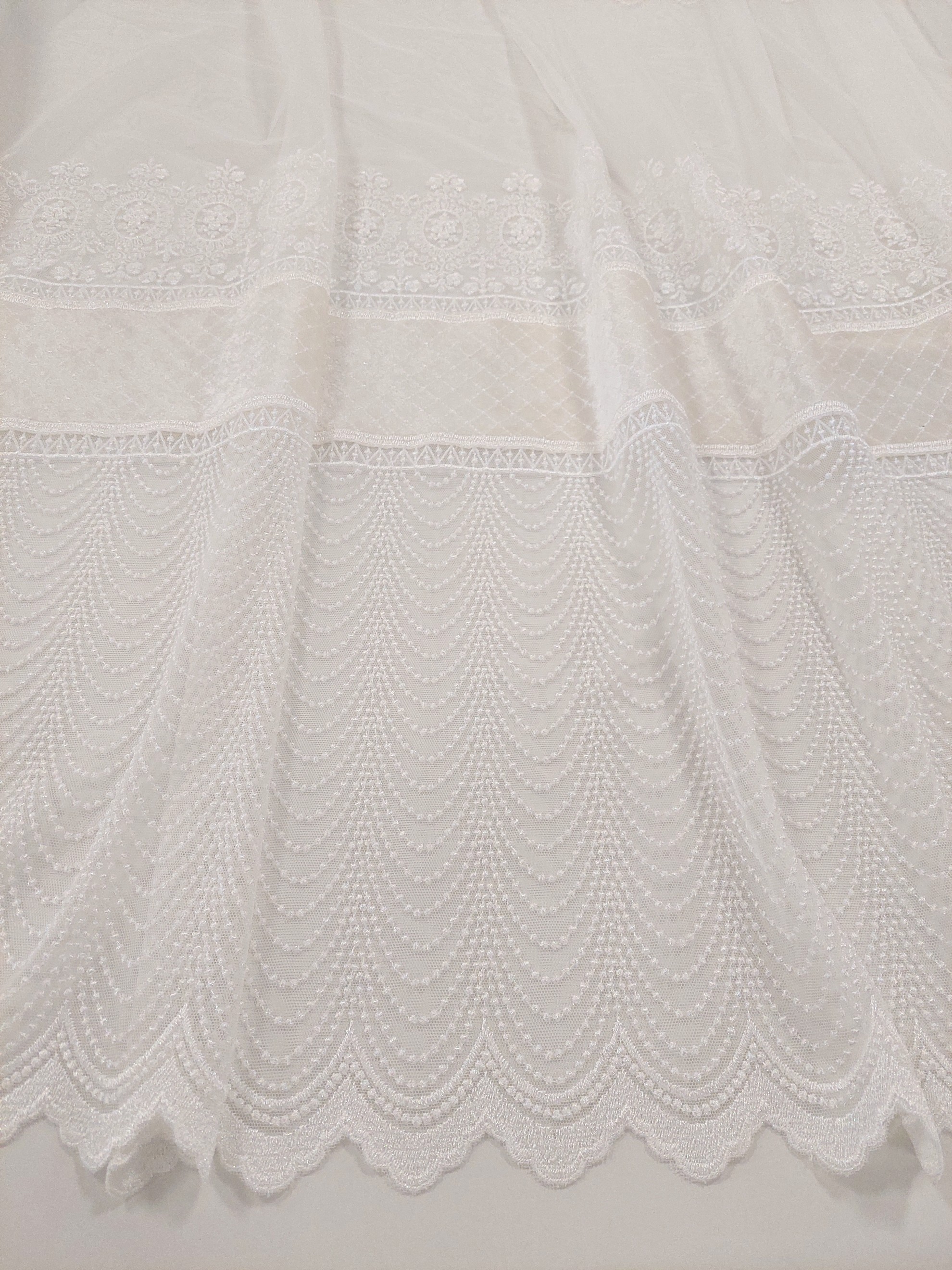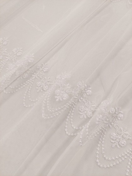 Este o perdea pe suport de tull cu borduri brodate în formă de falduri. Are inserții de catifea crem.