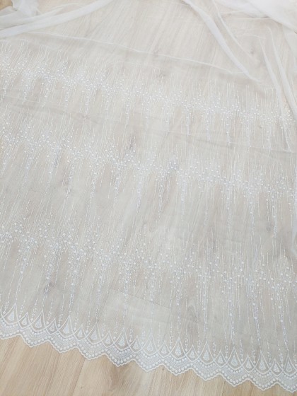 Este o perdea albă pe suport de tull cu broduri brodate în zig-zag.
