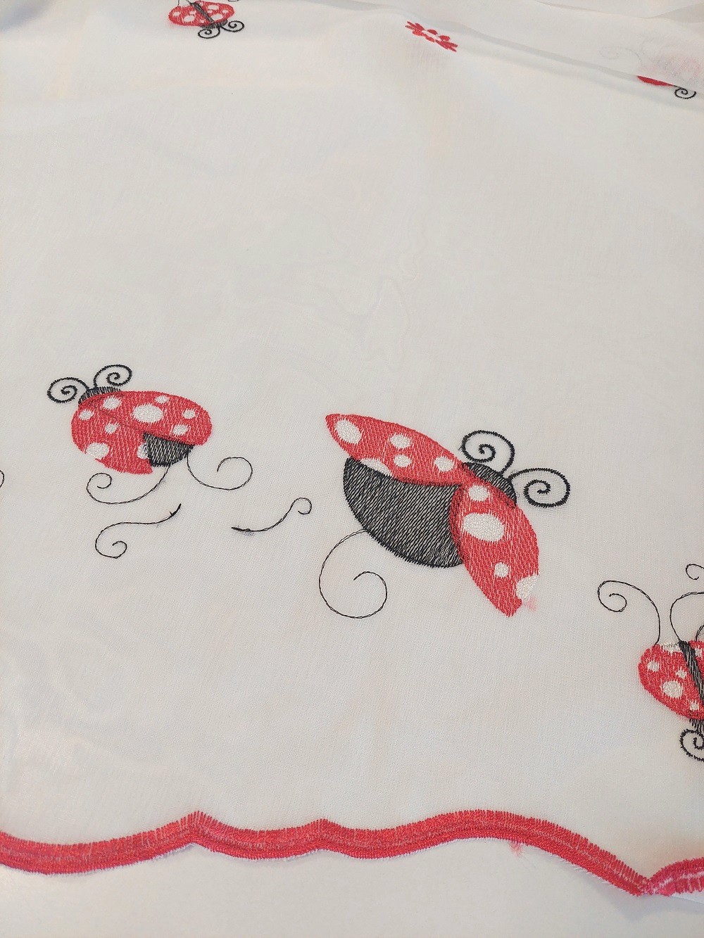 Este o perdea albă din imitație de in brodată cu buburuze.