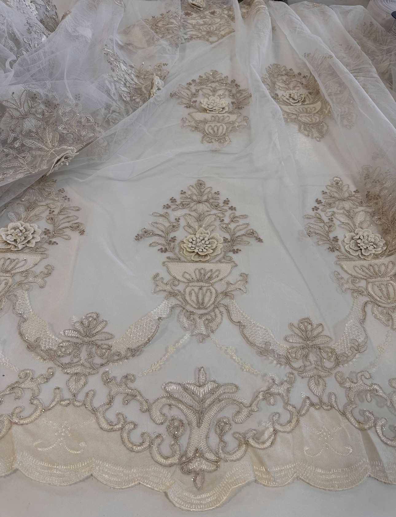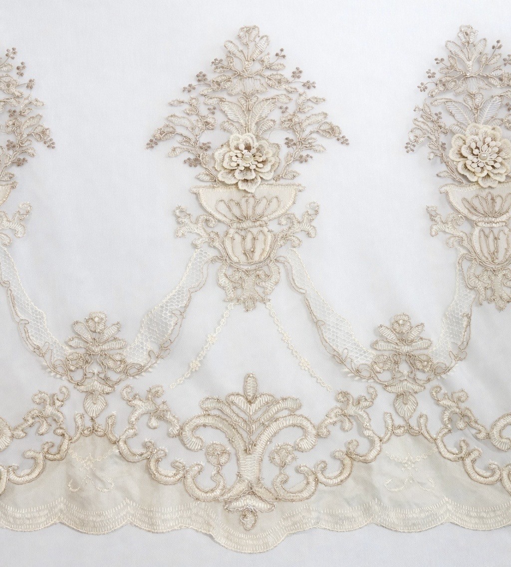 Este o perdea clasică din tull brodată cu 4 rânduri de medalioane și aplicații de flori brodate 3 D.
