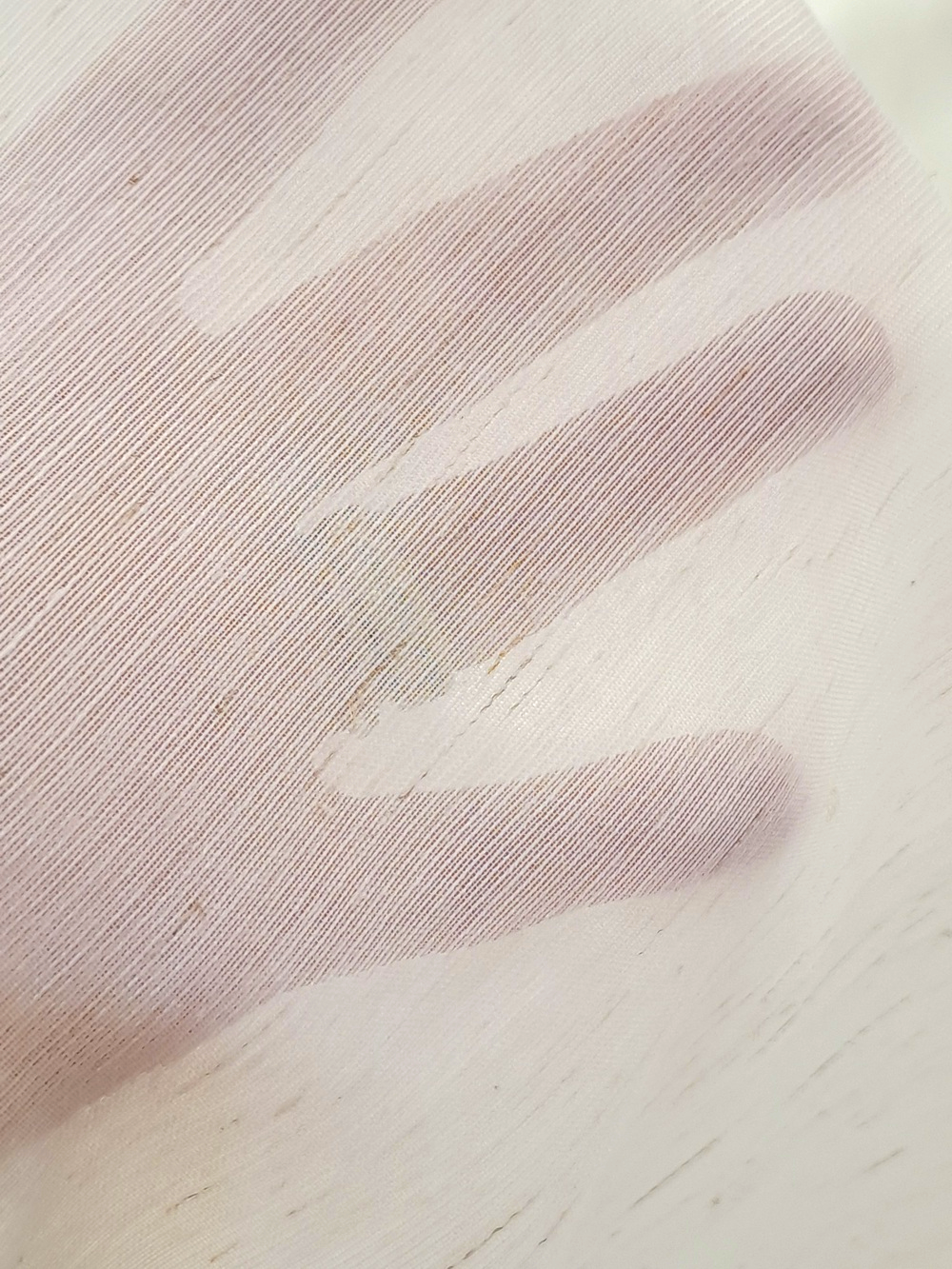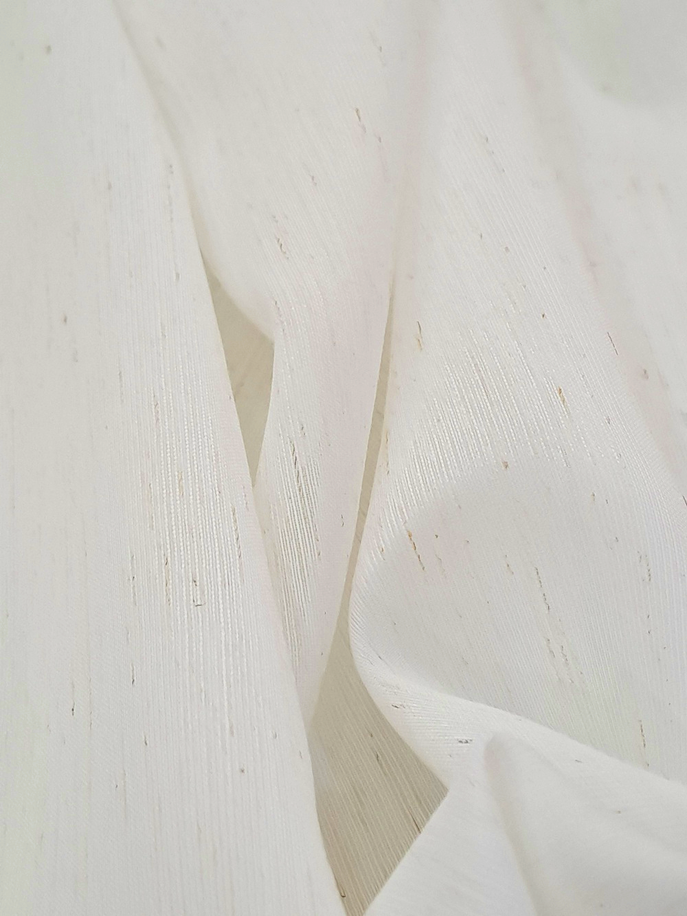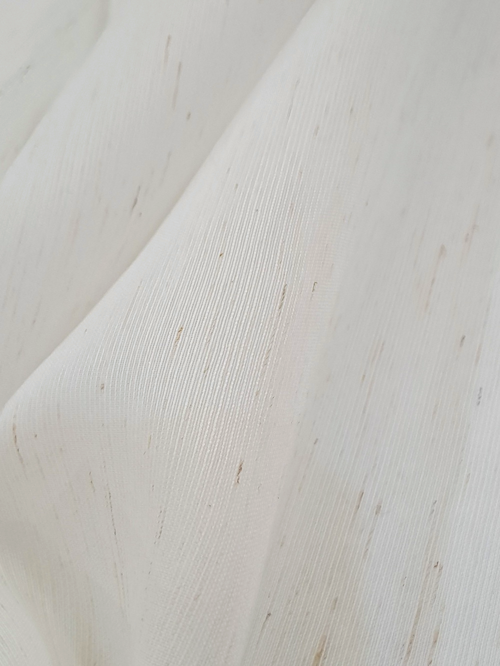 Este o perdea ivoar cu aspect bumbăcos. Pe vertical are dungulițe bej.