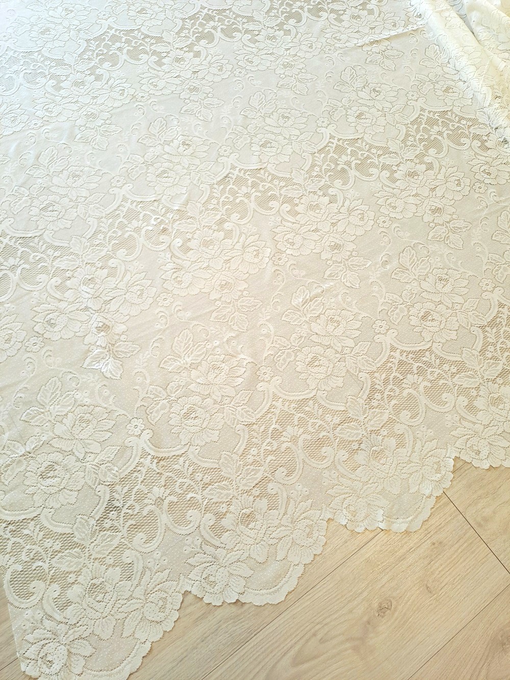 Este o perdea crem de Pașcani cu model floral. Are colțișori marginali doar într-o singură parte.