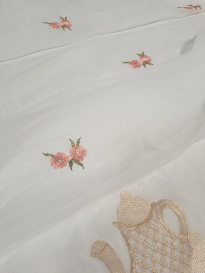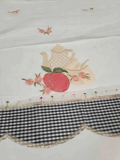 Este o perdea din voal alb brodată în partea de jos cu ceaineice, zaharnițe și fructe. În partea terminală este prevăzută cu o bordură din pânză în carouri negru cu alb.